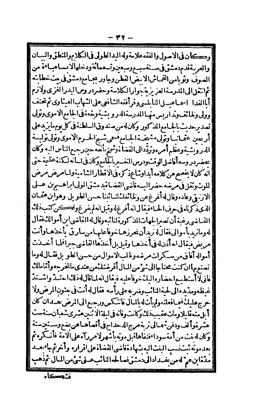 وَكَانَ فى الاصول وَالْفِقْه عَلامَة وَله الْيَد الطُّولى فى الْكَلَام والمنطق وَالْبَيَان والعربية قدم دمشق فى سنة سبع وَسبعين وَتِسْعمِائَة ودخلها لابسا عباءة من الصُّوف وثوبا من القماش الابيض الْقطن وجاور بِجَامِع دمشق فى بَيت خطابته ثمَّ انْتقل الى الْمدرسَة العزيزية جوَار الكلاسة وَحضر دروس الْبَدْر الغزى ولازم ابا الفدا اسماعيل النابلسى وَقَرَأَ فقه الشافعى على الشهَاب العيثاوى ثمَّ تحنف وَولى وظائف وتدريس مِنْهَا الْمدرسَة الدرويشية وبقعة فى الْجَامِع الاموى وَتَوَلَّى تصدير حَدِيث بالجامع الْمَذْكُور وَكَانَ لَهُ من صندوق السلطنة فى كل يَوْم مَا يزِيد على أَرْبَعِينَ عثمانيا وَتَوَلَّى مشيخة الْجَامِع فَسمى شيخ الْحرم الاموى وَتَوَلَّى تَوْلِيَة الدرويشية وَعظم أمره وَتردد الى الْقُضَاة وشمخ بِأَنْفِهِ حِين رَجَعَ النَّاس اليه وَكَانَ يحضر دروسه أفاضل الْوَقْت ودرس التَّفْسِير بالجامع وَكَانَ فى لِسَانه لكنة عَظِيمَة حَتَّى انه كَانَ لَا يفصح عَن كَلَامه أبدا وشاع ذكره فى الاقطار الشامية وَلما مرض مرض الْمَوْت وَثقل فى مَرضه حضر اليه قاضى الْقُضَاة بِدِمَشْق الْمولى ابراهيم بن على الازنبقى وعاده وَقَالَ لَهُ أفرغ عَن وظائفك لنائبنا حسن الطَّوِيل وَهُوَ ابْن عُثْمَان الذى ذَكرْنَاهُ فى حرف الْحَاء فَيُقَال انه أفرغ لَهُ وَقيل انه لم يفرغ وَلَكِن كتب ذَلِك القاضى رَغْبَة أَن تصير الْجِهَات الْمَذْكُورَة لنائبه وَقَالَ لَهُ القاضى ايْنَ أموالك فَقَالَ لَهُ وَمَا تُرِيدُ بأموالى فَقَالَ لَهُ نُرِيد أَن نحرزها خوفًا عَلَيْهَا من سَارِق يَأْخُذهَا وَأَنت مَرِيض فَيُقَال انه أذن لَهُ فى أَخذهَا وَقيل بل أَخذهَا القاضى جبرا فَلَمَّا أخذت أَمْوَاله أَفَاق من سَكَرَات مَرضه وَطلب الاموال من حسن الطَّوِيل فَقَالَ لَهُ وَمَا تصنع بهَا ان كنت مُحْتَاجا الى شئ من المَال أقرضتك من عندى مَا تخرجه وَأما مَالك فانى لَا أَسْتَطِيع احضاره اليك خوفًا عَلَيْهِ فَيُقَال انه لما قَالَ ذَلِك احتد وَاشْتَدَّ غيظه وَمد يَده الى لحية النَّائِب وضربه على رَأسه فَقَالَ لَهُ أَنْت فى جُنُون الْمَرَض وَلَا حرج عَلَيْك فِيمَا فعلته وَلم يَأْتِ لَهُ بِالْمَالِ فانتكس وَرجع الى الْمَرَض بعد ان كَانَ أبل مِنْهُ قَلِيلا وَمَات عقيب ذَلِك وَكَانَت وَفَاته فى لَيْلَة الِاثْنَيْنِ عشرى شعْبَان سنة سِتّ عشرَة وَألف وَدفن شمالى تربة مرج الدحداح فى أقصاها عَن بضع وَسِتِّينَ سنة وَكَانَ بنت من أمة سَوْدَاء فنفاها قبل مَوته بأشهر لامر رَآهُ على الامة فَأنكرهُ ثمَّ بعد مَوته ثَبت نسب الْبِنْت اليه بِشَهَادَة قاضى الْقُضَاة على اقراره واخر ثمَّ جَاءَ بعد مُدَّة ابْن عَم لَهُ من بَغْدَاد الى دمشق فَصَالحه النَّائِب على شئ من المَال ثمَّ ذهب