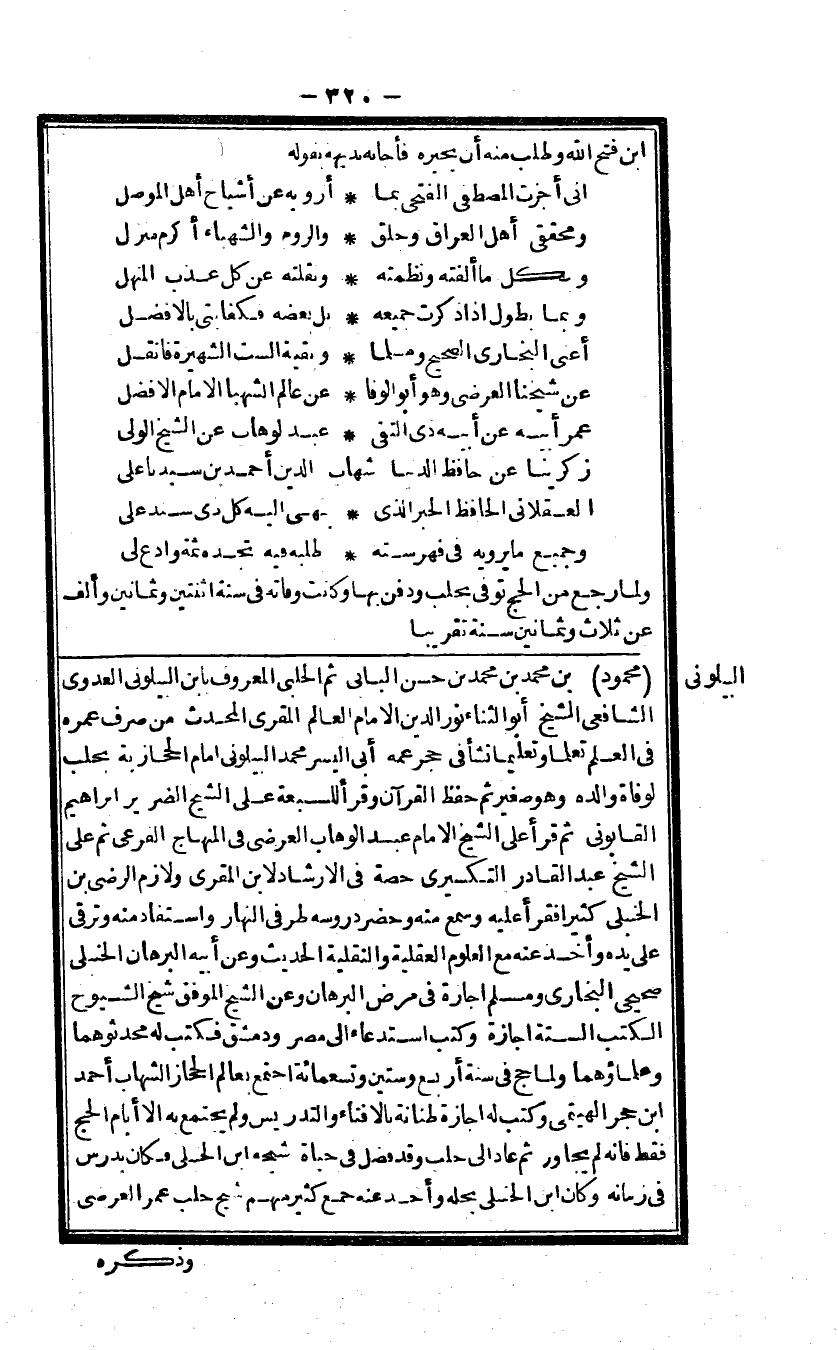 مَحْمُود بن مُحَمَّد بن مُحَمَّد بن حسن البابى ثمَّ الحلبى الْمَعْرُوف بِابْن البيلونى الْعَدْوى الشافعى الشَّيْخ أَبُو الثَّنَاء نور الدّين الامام الْعَالم المقرى الْمُحدث من صرف عمره فى الْعلم تعلما وتعليما نَشأ فى حجر عَمه أَبى الْيُسْر مُحَمَّد البيلونى امام الحجازية بحلب لوفاة وَالِده وَهُوَ صَغِير ثمَّ حفظ الْقُرْآن وَقَرَأَ للسبعة على الشَّيْخ الضَّرِير ابراهيم القابونى ثمَّ قَرَأَ على الشَّيْخ الامام عبد الْوَهَّاب العرضى فى المهاج الفرعى ثمَّ على الشَّيْخ عبد الْقَادِر التكسيرى حِصَّة فى الارشاد لِابْنِ المقرى ولازم الرضى بن الحنبلى كثيرا فَقَرَأَ عَلَيْهِ وَسمع مِنْهُ وَحضر دروسه طرفى النَّهَار واستفاد مِنْهُ وترقى على يَده وَأخذ عَنهُ مَعَ الْعُلُوم الْعَقْلِيَّة والنقلية الحَدِيث وَعَن أَبِيه الْبُرْهَان الحنبلى صحيحى البخارى وَمُسلم اجازة فى مرض الْبُرْهَان وَعَن الشَّيْخ الْمُوفق شيخ الشُّيُوخ الْكتب السِّتَّة اجازة وَكتب استدعاء الى مصر ودمشق فَكتب لَهُ محدثوهما وعلماؤهما وَلما حج فى سنة أَربع وَسِتِّينَ وَتِسْعمِائَة اجْتمع بعالم الْحجاز الشهَاب أَحْمد ابْن حجر الهيتمى وَكتب لَهُ اجازة طنانة بالافتاء والتدريس وَلم يجْتَمع بِهِ الا أَيَّام الْحَج فَقَط فانه لم يجاور ثمَّ عَاد الى حلب وَقد فضل فى حَيَاة شَيْخه ابْن الحنبلى فَكَانَ يدرس فى زَمَانه وَكَانَ ابْن الحنبلى يجله وَأخذ عَنهُ جمع كثير مِنْهُم شيخ حلب عمر العرضى