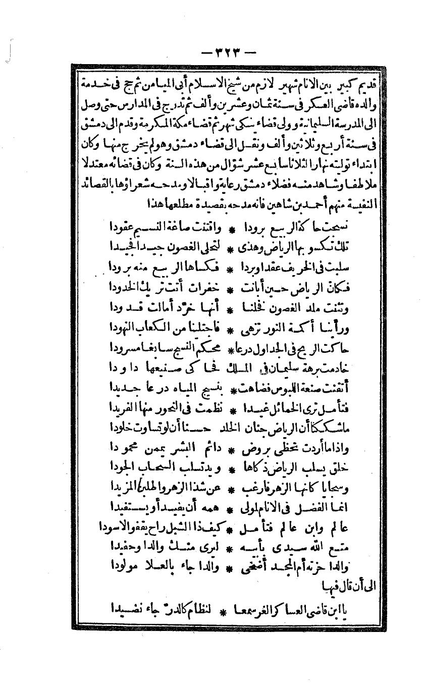 قديم كَبِير بَين الانام شهير لَازم من شيخ الاسلام أَبى الميامن ثمَّ حج فى خدة وَالِده قاضى الْعَسْكَر فى سنة ثَمَان وَعشْرين وَألف ثمَّ تدرج فى الْمدَارِس حَتَّى وصل الى الْمدرسَة السليمانية وَولى قَضَاء ينكى شهر ثمَّ قَضَاء مَكَّة المكرمة وَقدم إِلَى دمشق فِي سنة أَربع وَثَلَاثِينَ وَألف وَنقل إِلَى قَضَاء دمشق وَهُوَ لم يخرج مِنْهَا وَكَانَ ابْتِدَاء تَوليته نَهَار الثلاثا سَابِع عشر شَوَّال من هَذِه السّنة وَكَانَ فى قَضَائِهِ معتدلا ملاطفا وَشَاهد مِنْهُ فضلاء دمشق رِعَايَة واقبالا ومدحه شعراؤها بالقصائد النفيسة مِنْهُم أَحْمد بن شاهين فانه مدحه بقصيدة مطْلعهَا هَذَا