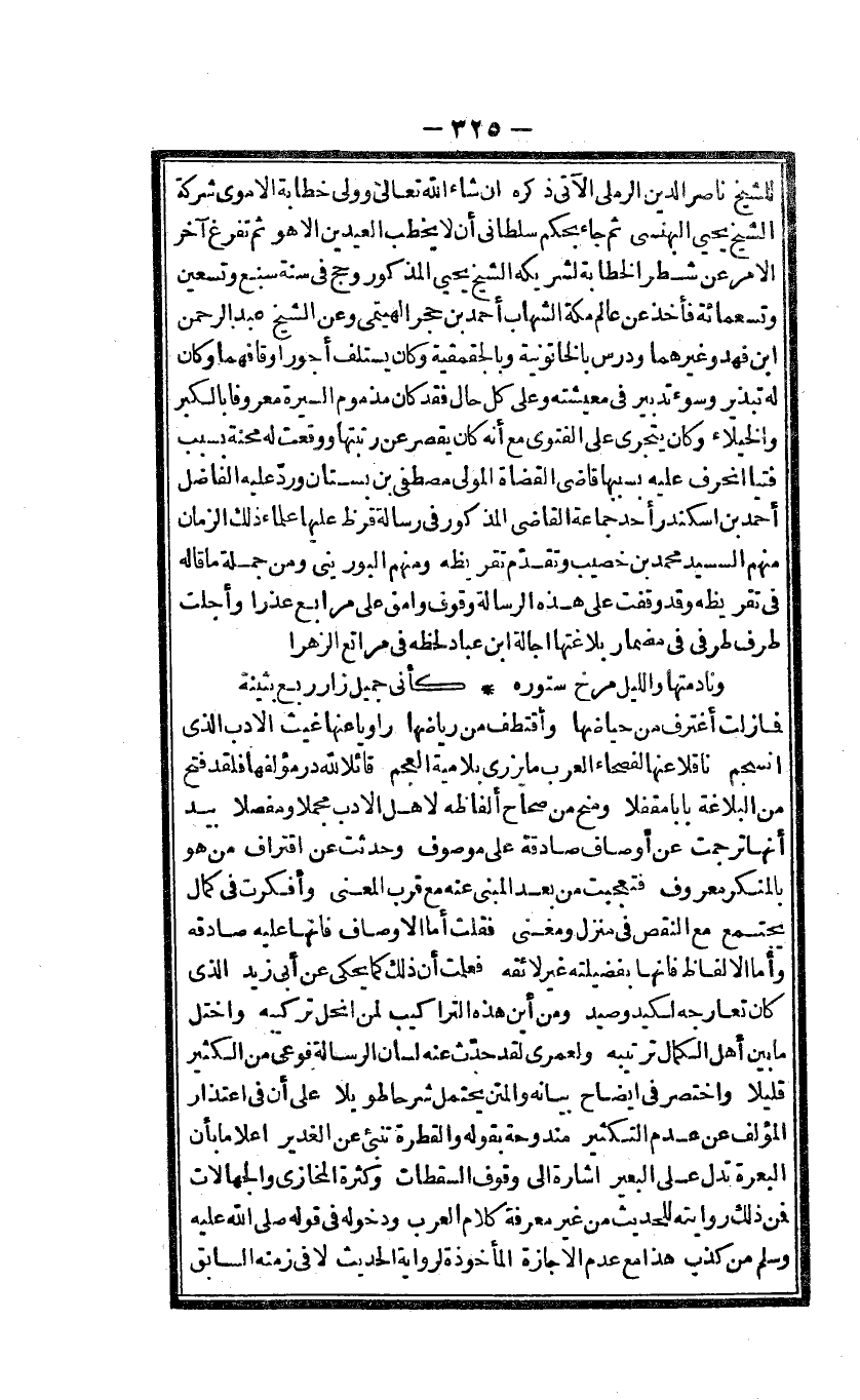فَمَا زلت أغترف من حياضها وأقتطف من رياضها رَاوِيا عَنْهَا غيث الادب الذى انسجم نَاقِلا عَنْهَا الفصحاء الْعَرَب مَا يزرى بلامية الْعَجم قَائِلا لله در مؤلفها فَلَقَد فتح من البلاغة بَابا مقفلا ومنح من صِحَاح أَلْفَاظه لاهل الادب مُجملا ومفصلا بيد أَنَّهَا ترجمت عَن أَوْصَاف صَادِقَة على مَوْصُوف وَحدثت عَن اقتراف من هُوَ بالمنكر مَعْرُوف فتعجبت من بعد المبنى عَنهُ مَعَ قرب الْمَعْنى وأفكرت فى كَمَال يجْتَمع مَعَ النَّقْص فى منزل ومغنى فَقلت أما الاوصاف فانها عَلَيْهِ صَادِقَة وَأما الالفاظ بفضلته غير لائقة فَعلمت أَن ذَلِك كَمَا يحْكى عَن أَبى زيد الذى كَانَ تعارجه لكيد وصيد وَمن أَيْن هَذِه التراكيب لمن انحل تركيبه واختل مَا بَين أهل الْكَمَال ترتيبه ولعمرى لقد حدث عَنهُ لِسَان الرسَالَة فوعى من الْكثير قَلِيلا وَاخْتصرَ فى ايضاح بَيَانه والمتن يحْتَمل شرحا طَويلا على أَن فى اعتذار الْمُؤلف عَن عدم التكثير مندوحة بقوله والقطرة تنبئ عَن الغدير اعلاما بِأَن البعرة تدل على الْبَعِير اشارة الى وقُوف السقطات وَكَثْرَة المخازى والجهالات فَمن ذَلِك رِوَايَته للْحَدِيث من غير معرفَة كَلَام الْعَرَب ودخوله قَوْله