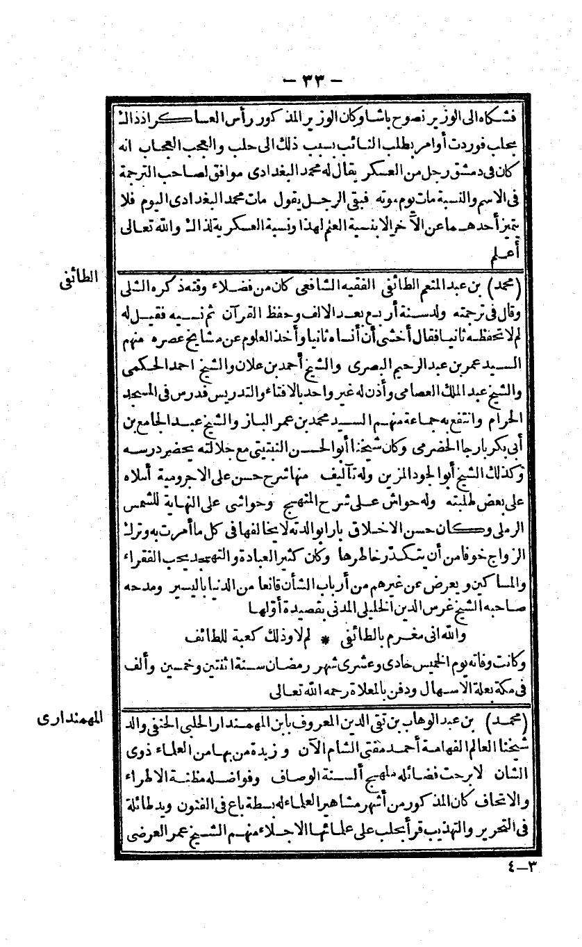 مُحَمَّد بن عبد الْمُنعم الطائفى الْفَقِيه الشافعى كَانَ من فضلاء وقته ذكره الشلى وَقَالَ فى تَرْجَمته ولد سنة أَربع بعد الالف وَحفظ الْقُرْآن ثمَّ نَسيَه فَقيل لَهُ لم لَا تحفظه ثَانِيًا فَقَالَ أخْشَى أَن أنساه ثَانِيًا وَأخذ الْعُلُوم عَن مَشَايِخ عصره مِنْهُم السَّيِّد عمر بن عبد الرَّحِيم البصرى وَالشَّيْخ أَحْمد بن عَلان وَالشَّيْخ احْمَد الحكمى وَالشَّيْخ عبد الْملك العصامى وَأذن لَهُ غير وَاحِد بالافتاء والتدريس فدرس فى الْمَسْجِد الْحَرَام وانتفع بِهِ جمَاعَة مِنْهُم السَّيِّد مُحَمَّد بن عمر الباز وَالشَّيْخ عبد الْجَامِع بن أَبى بكر بارجا الحضرمى وَكَانَ شَيخنَا أَبُو الْحسن النبتيتى مَعَ جلالته يحض درسه وَكَذَلِكَ الشَّيْخ أَبُو الْجُود المزين وَله تآليف مِنْهَا شرح حسن على الاجرومية أملاه على بعض طلبته وَله حواش على شرح الْمنْهَج وحواشى على النِّهَايَة للشمس الرملى وَكَانَ حسن الاخلاق بارا بوالدته لَا يُخَالِفهَا فى كل مَا أمرت بِهِ وَترك الزواج خوفًا من أَن يتكدر خاطرها وَكَانَ كثير الْعِبَادَة والتهجد يحب الْفُقَرَاء وَالْمَسَاكِين ويعرض عَن غَيرهم من أَرْبَاب الشَّأْن قانعا من الدُّنْيَا باليسير ومدحه صَاحبه الشَّيْخ غرس الدّين الخليلى المدنى بقصيدة أَولهَا