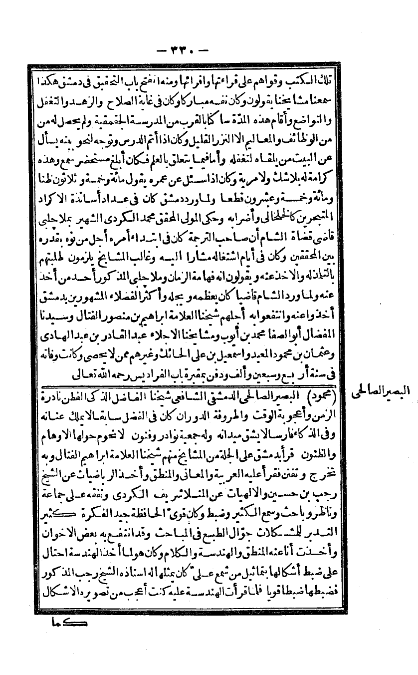تِلْكَ الْكتب وقواهم على قرَاءَتهَا واقرائها وَمِنْه انْفَتح بَاب التَّحْقِيق فى دمشق هَكَذَا سمعنَا مَشَايِخنَا يَقُولُونَ وَكَانَ نَفسه مُبَارَكًا وَكَانَ فى غَايَة الصّلاح والزهد والتغفل والتواضع وَأقَام هَذِه الْمدَّة سَاكِنا بِالْقربِ من الْمدرسَة الجقمقية وَلم يحصل لَهُ من من الْوَظَائِف والمعاليم الا النزر الْقَلِيل وَكَانَ اذا أتم الدَّرْس وَتوجه لنَحْو بَيته يسْأَل عَن الْبَيْت من يلقاه لتغفله وَأما فِيمَا يتَعَلَّق بِالْعلمِ فَكَانَ أبلغ مستحضر سمع وَهَذِه كَرَامَة لَهُ بِلَا شكّ وَلَا مرية وَكَانَ اذا سُئِلَ عَن عمره يَقُول مائَة وَخَمْسَة وَثَلَاثُونَ ظنا وَمِائَة وَخَمْسَة وَعِشْرُونَ قطعا وَلما ورد دمشق كَانَ فى عداد أساتذة الاكراد المتبحرين كالخلخالى وَأَضْرَابه وَحكى الْمولى الْمُحَقق مُحَمَّد الكردى الشهير بملا حلبى قاضى قُضَاة الشَّام أَن صَاحب التَّرْجَمَة كَانَ فى ابْتِدَاء أمره أجل من نوه بِقَدرِهِ بَين الْمُحَقِّقين وَكَانَ فى أَيَّام اشْتِغَاله مشارا اليه وغالب الْمَشَايِخ يلزمون طلبتهم بالتلمذ لَهُ والاخذ عَنهُ وَيَقُولُونَ انه فهامة الزَّمَان وملا حلبى الْمَذْكُور أحد من أَخذ عَنهُ وَلما ورد الشَّام قَاضِيا كَانَ يعظمه ويجله وَأكْثر الْفُضَلَاء الْمَشْهُورين بِدِمَشْق أخذُوا عَنهُ وانتفعوا بِهِ أَجلهم شَيخنَا الْعَلامَة ابراهيم بن مَنْصُور الفتال وَسَيِّدنَا المفضال أَبُو الصَّفَا مُحَمَّد بن أَيُّوب ومشايخنا الاجلاء عبد الْقَادِر بن عبد الهادى وَعُثْمَان بن مَحْمُود المعيد واسماعيل بن على الحائك وَغَيرهم مِمَّن لَا يُحْصى وَكَانَت وَفَاته فى سنة أَربع وَسبعين وَألف وَدفن بمقبرة بَاب الفراديس رَحمَه الله تَعَالَى