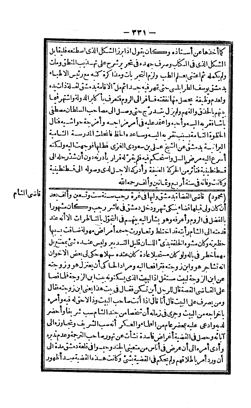 كَمَا أَخذهَا عَن أستاذه وَكَانَ يَقُول اذا برز الشكل الذى اصطنعه فليقابل الشكل الذى فى الْكتاب وَصرف جهده فى تَحْرِير شرح على تَهْذِيب الْمنطق وَمَات وَلم يكمله ثمَّ اعتنى بِعلم الطِّبّ وَلزِمَ التجربات ومذاكرة كتبه مَعَ رَئِيس الاطباء بِدِمَشْق يُوسُف الطرابلسى حَتَّى تمهر فِيهِ جدا ثمَّ مل الاقامة بِدِمَشْق لقلَّة ذَات يَده وَلعدم وَظِيفَة يحصل مِنْهَا نَفَقَته فسافر الى الرّوم فتعرف بأكابر الدولة واشتهر فِيمَا بَينهم بالحذق والفهم وَلم يزل يتدرج حَتَّى وصل الى مصاحب السُّلْطَان مصطفى باشا فقربه اليه وأحبه وَاعْتمد عَلَيْهِ فى أَمر مزاجه وأمزجة حَوَاشِيه فنال الحظوة التَّامَّة بِسَبَب تقربه اليه وساعده الْحَظ فانحلت الْمدرسَة الشامية البرانية بِدِمَشْق عَن الشَّيْخ على بن سعودى الغزى فطلبها فوجهت اليه وَلكنه أسْرع اليه مرض السل واستحكم فِيهِ فَلم يقر لَهُ قَرَار بأدرنه دون أَن شدّ رَحْله الى قسطنطينية فتأثر من الْحَرَكَة العنيفة وأدركه الاجل لَدَى وُصُوله الى قسطنطينية وَكَانَ وَفَاته فى سنة أَربع وَثَمَانِينَ وَألف رَحمَه الله