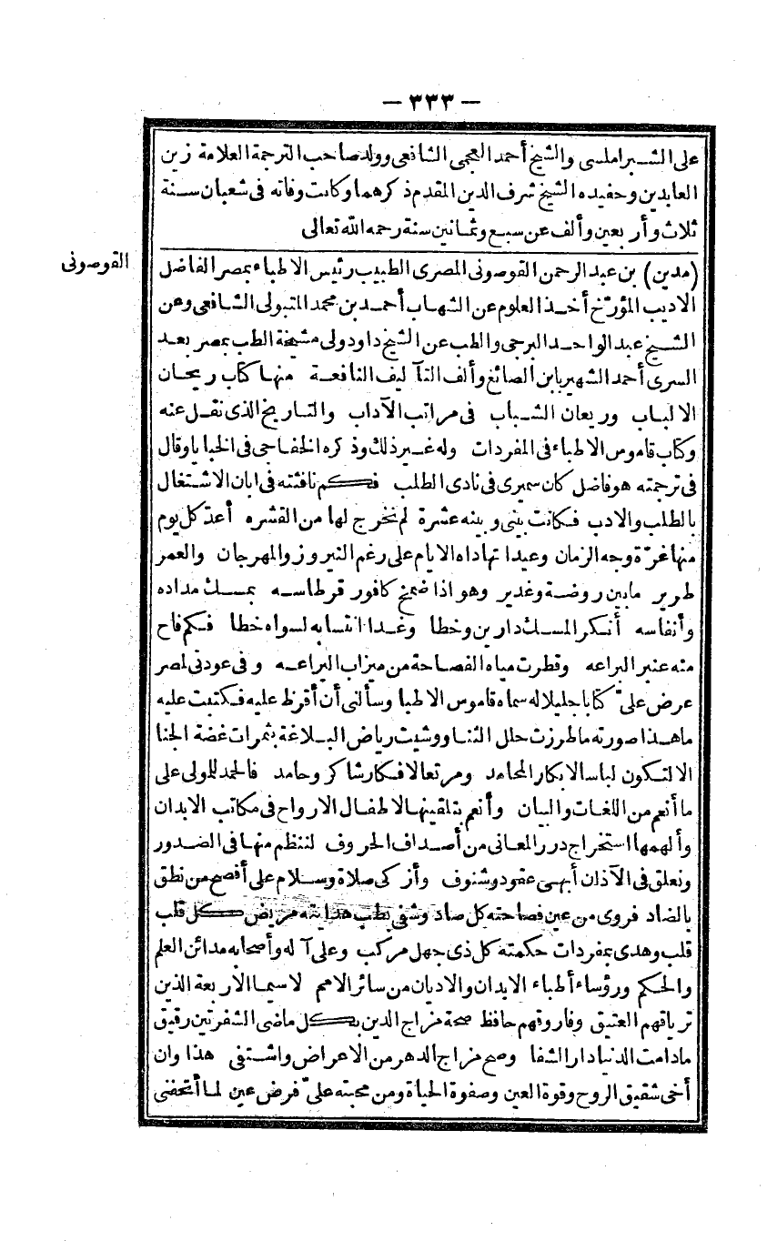 مَدين بن عبد الرَّحْمَن القوصونى المصرى الطَّبِيب رَئِيس الاطباء بِمصْر الْفَاضِل الاديب المؤرخ أَخذ الْعُلُوم عَن الشهَاب أَحْمد بن مُحَمَّد المتبولى الشافعى وَعَن الشَّيْخ عبد الْوَاحِد البرجى والطب والطلب عَن الشَّيْخ دَاوُد ولى مشيخة الطِّبّ بِمصْر بعد السرى أَحْمد الشهير بِابْن الصَّائِغ وَألف التآليف النافعة مِنْهَا كتاب ريحَان الالباب وريعان الشَّبَاب فى مَرَاتِب الْآدَاب والتاريخ الذى نقل عَنهُ وَكتاب قَامُوس الاطباء فى الْمُفْردَات وَله غير ذَلِك وَذكره الخفاجى فى الخبايا وَقَالَ فى تَرْجَمته هُوَ فَاضل كَانَ سميرى فى نَادَى الطّلب فكم نافثته فى ابان الِاشْتِغَال بِالطَّلَبِ والادب فَكَانَت بينى وَبَينه عشرَة لم نخرج لَهَا من القشره أعد كل يَوْم مِنْهَا غرَّة وَجه الزَّمَان وعيدا تهاداه الايام على رغم النيروز والمهرجان والعمر طرير مَا بَين رَوْضَة وغدير وَهُوَ اذا ضمخ كافور قرطاسه بمسك مداده وأنفاسه أنكر الْمسك دارين وخطا وَغدا انتسابه لواه خطا فكم فاح مِنْهُ عنبر البراعه وقطرت مياه الفصاحة من ميزاب اليراعه وفى عودتى لمصر عرض على كتابا جَلِيلًا لَهُ سَمَّاهُ قَامُوس الاطبا وسألنى أَن أقرظ عَلَيْهِ فَكتبت عَلَيْهِ مَا هَذَا صورته مَا طرزت حلل الثنا ووشيت رياض البلاغة بثمرات غضة الجنا الا لتَكون لباسا الابكار المحامد ومرتعا لافكار شَاكر وحامد فَالْحَمْد للْمولى على مَا أنعم من اللغاة وَالْبَيَان وأنعم بتلقينها الاطفال والارواح فى مكَاتب الابدان وألهمها اسْتِخْرَاج دُرَر الْمعَانى من أصداف الْحُرُوف لننظم مِنْهَا فى الصُّدُور ونعلق فى الآذان أبهى عُقُود وشنوف وأزكى صَلَاة وَسَلام على أفْصح من نطل بالضاد فروى من عين فَصَاحَته كل صَاد وشفى بطب هدايته مَرِيض كل قلب قلب وَهدى بمفردات حكمته كل ذى جهل مركب وعَلى آله وَأَصْحَابه مَدَائِن الْعلم وَالْحكم ورؤساء أطباء الابدان والاديان من سَائِر الامم لَا سِيمَا الاربعة الَّذين ترياقهم الْعَتِيق وفاروقهم حَافظ صِحَة مزاج الدّين بِكُل ماضى الشفرتين رَقِيق مَا دَامَت الدُّنْيَا دَار الشفا وَصَحَّ مزاج الدَّهْر من الاعراض واشتفى هَذَا وان أخى شَقِيق الرّوح وَقُوَّة الْعين وصفوة الْحَيَاة وَمن محبته على فرض عين لما أتحفنى