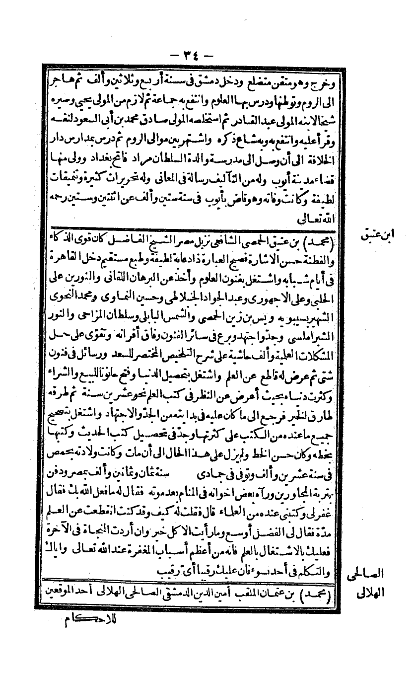 وَخرج وَهُوَ متقن متضلع وَدخل دمشق فى سنة أَربع وَثَلَاثِينَ وَألف ثمَّ هَاجر الى الرّوم وتوطنها ودرس بهَا الْعُلُوم وانتفع بِهِ جمَاعَة ثمَّ لَازم من الْمولى يحيى وصيره شَيخا لِابْنِهِ الْمولى عبد الْقَادِر ثمَّ استخلصه الْمولى صَادِق مُحَمَّد بن أَبى السُّعُود لنَفسِهِ وَقَرَأَ عَلَيْهِ وانتفع بِهِ وَبِه شاع ذكره واشتهر بَين موالى الرّوم ثمَّ درس بمدارس دَار الْخلَافَة الى أَن وصل الى مدرسة وَالِدَة السُّلْطَان مُرَاد فاتح بَغْدَاد وَولى مِنْهَا قَضَاء مَدِينَة أَيُّوب وَله من التآليف رِسَالَة فى الْمعَانى وَله تحريرات كَثِيرَة وتميقات لَطِيفَة وَكَانَت وَفَاته وَهُوَ قَاض بِأَيُّوب فى سنة سِتِّينَ وَألف عَن اثْنَتَيْنِ وَسِتِّينَ رَحمَه الله تَعَالَى