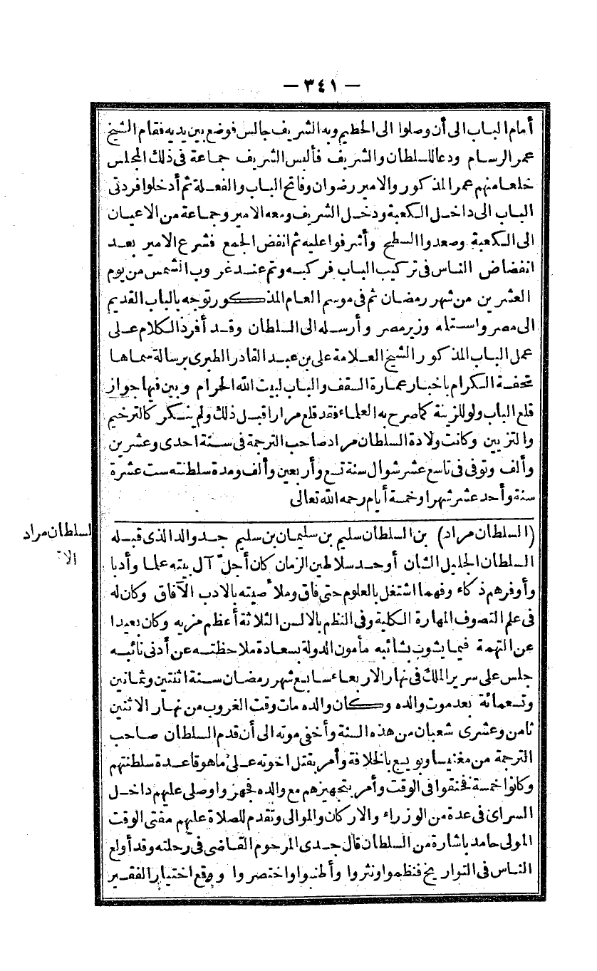 أَمَام الْبَاب الى أَن وصلوا الى الْحطيم وَبِه الشريف جَالس فَوضع بَين يَدَيْهِ فَقَامَ الشَّيْخ عمر الرسام ودعا للسُّلْطَان والشريف فألبس الشريف جمَاعَة فى ذَلِك الْمجْلس خلعا مِنْهُم عمر الْمَذْكُور والامير رضوَان وفاتح الْبَاب والفعلة ثمَّ أدخلُوا فردتى الْبَاب الى دَاخل الْكَعْبَة وَدخل الشريف وَمَعَهُ الْأَمِير وَجَمَاعَة من الْأَعْيَان إِلَى الْكَعْبَة وصعدوا السَّطْح وأشرفوا عَلَيْهِ ثمَّ انفض الْجمع فشرع الامير بعد انفضاض النَّاس فى تركيب الْبَاب فركبته وَتمّ عِنْد غرُوب الشَّمْس من يَوْم الْعشْرين من شهر رَمَضَان ثمَّ فى موسم الْعَام الْمَذْكُور توجه بِالْبَابِ الْقَدِيم الى مصر واستمله وَزِير مصر وأرسله الى السُّلْطَان وَقد أفرد الْكَلَام على عمل الْبَاب الْمَذْكُور الشَّيْخ الْعَلامَة على بن عبد الْقَادِر الطبرى برسالة سَمَّاهَا تحفة الْكِرَام باخبار عمَارَة السّقف وَالْبَاب لبيت الله الْحَرَام وَبَين فِيهَا جَوَاز قلع الْبَاب وَلَو للزِّينَة كَمَا صرح بِهِ الْعلمَاء فقد قلع مرَارًا قبل ذَلِك وَلم يُنكر كالترخيم والتزيين وَكَانَت ولادَة السُّلْطَان مُرَاد صَاحب التَّرْجَمَة فى سنة احدى وَعشْرين وَألف وَتوفى فى تَاسِع عشر شَوَّال سنة تسع وَأَرْبَعين وَألف وَمُدَّة سلطنته سِتّ عشرَة سنة وَأحد عشر شهرا وَخَمْسَة أَيَّام رَحمَه الله تَعَالَى
