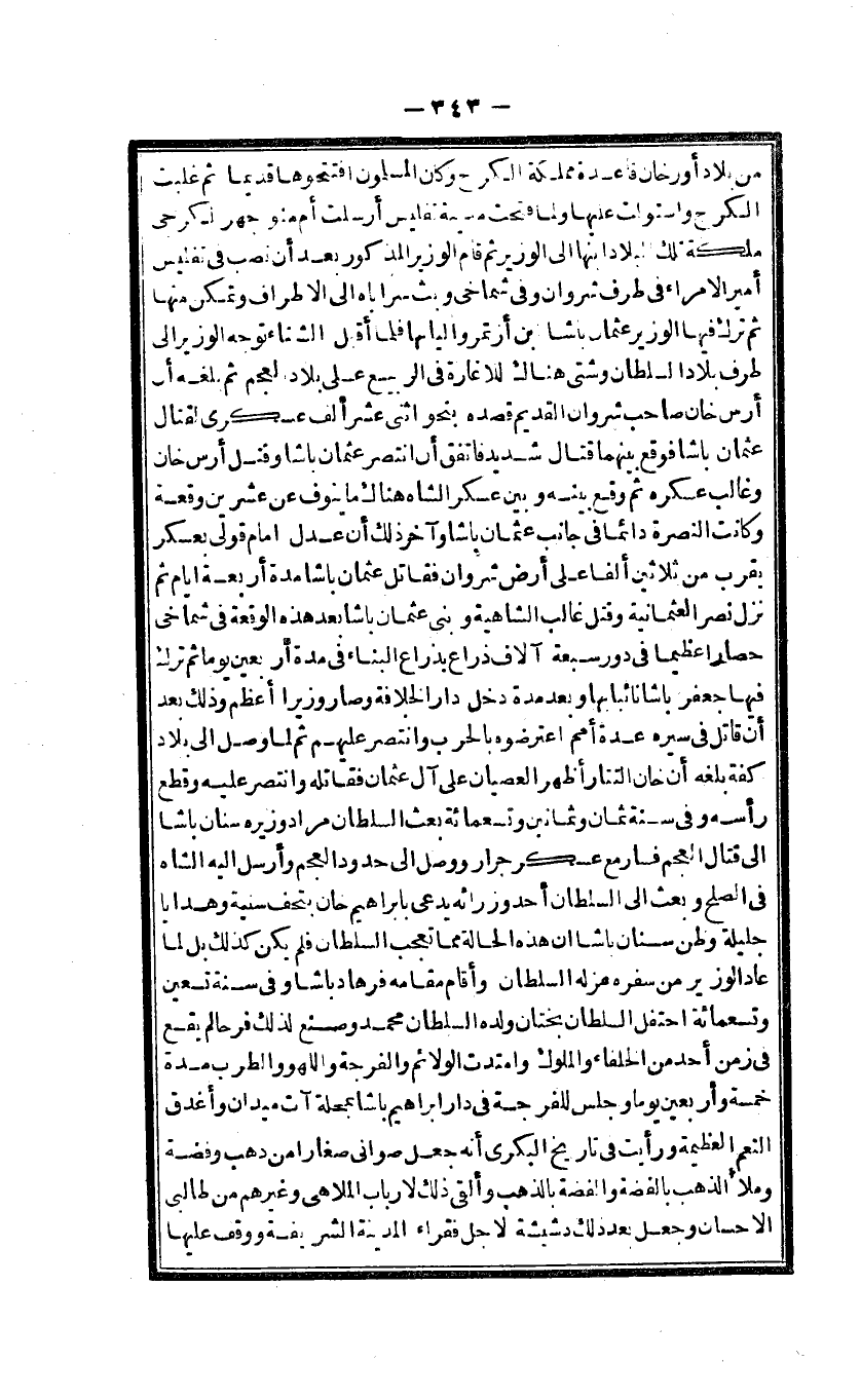 من بِلَاد أورخان قَاعِدَة مملكة الكرج وَكَانَ الْمُسلمُونَ افتتحوها قَدِيما ثمَّ غلبت الكرج واستولت عَلَيْهَا وَلما فتحت مَدِينَة تفليس أرْسلت أم منوجهرالكرجى ملكة تِلْكَ الْبِلَاد ابْنهَا الى الْوَزير ثمَّ قَامَ الْوَزير الْمَذْكُور بعد أَن نصب فى تفليس أَمِير الامراء فى طرف شرْوَان وفى شماخى وَبث سراياه الى الاطرف وَتمكن مِنْهَا ثمَّ ترك فِيهَا الْوَزير عُثْمَان باشا ابْن أزتمر واليا بهَا فَلَمَّا أقبل الشتَاء توجه الْوَزير الى طرف بِلَاد السُّلْطَان وشتى هُنَاكَ للاغارة فى الرّبيع على بِلَاد الْعَجم ثمَّ بلغه أَن أرسخان صَاحب شرْوَان الْقَدِيم قَصده بِنَحْوِ اثنى عشر ألف عسكرى لقِتَال عُثْمَان باشا فَوَقع بَينهمَا قتال شَدِيد فاتفق أَن انتصر عُثْمَان باشا وَقتل أرس خَان وغالب عسكره ثمَّ وَقع بَينه وَبَين عَسْكَر الشاه هُنَاكَ مَا ينوف عَن عشْرين وقْعَة كَانَت النُّصْرَة دَائِما فى جَانب عُثْمَان باشا وَآخر ذَلِك أَن عدل امام قولى بعسكر يقرب من ثَلَاثِينَ ألفا على أَرض شرْوَان فقاتل عُثْمَان باشا مُدَّة أَرْبَعَة ايام ثمَّ نزل نصر العثمانية وَقتل غَالب الشاهية وَبنى عُثْمَان باشا بعد هَذِه الْوَقْعَة فى شماخى حصارا عَظِيما فى دور سَبْعَة آلَاف ذِرَاع بِذِرَاع الْبناء فى مُدَّة أَرْبَعِينَ يَوْمًا ثمَّ ترك حصارا عَظِيما فى دور سَبْعَة آلَاف ذِرَاع بِذِرَاع الْبناء فى مُدَّة أَرْبَعِينَ يَوْمًا ثمَّ ترك فِيهَا جَعْفَر باشا نَائِبا بهَا وَبعد مُدَّة دخل دَار الْخلَافَة وَصَارَ وزيرا أعظم وَذَلِكَ بعد أَن قَاتل فى سره عدَّة أُمَم اعْتَرَضُوهُ بِالْحَرْبِ وانتصر عَلَيْهِم ثمَّ لما وصل الى بِلَاد كفة بلغه أَن خَان التتار أظهر الْعِصْيَان على آل عُثْمَان فقاتله وانتصر عَلَيْهِ وَقطع رَأسه وفى سنة ثَمَان وَثَمَانِينَ وَتِسْعمِائَة بعث السُّلْطَان مُرَاد وزيره سِنَان باشا الى قتال الْعَجم فَسَار مَعَ عَسْكَر جرار وَوصل الى حُدُود الْعَجم وَأرْسل اليه الشاه فى الصُّلْح وَبعث الى السُّلْطَان أحد وزرائه يدعى بابراهيم خَان بتحف سنية وهدايا جليلة وَظن سِنَان باشا ان هَذِه الْحَالة مِمَّا تعجب فَلم يكن كَذَلِك بل لما عَاد الْوَزير من سَفَره عَزله السُّلْطَان وَأقَام مقَامه فرهاد باشا وفى سنة تسعين وَتِسْعمِائَة احتفل السُّلْطَان بختان وَلَده السُّلْطَان مُحَمَّد وصنع لذَلِك فَرحا لم يَقع فى زمن أحد من الْخُلَفَاء والملوك وامتدت الولائم والفرجة وَاللَّهْو والطرب مُدَّة خَمْسَة وَأَرْبَعين يَوْمًا وَجلسَ للفرجة فى دَار ابراهيم باشا بمحلة آتٍ ميدان وأغدق النعم الْعَظِيمَة وَرَأَيْت فى تَارِيخ البكرى أَنه جعل صوانى صغَارًا من ذهب وفضلة وملأ الذَّهَب بِالْفِضَّةِ وَالْفِضَّة بِالذَّهَب وَألقى ذَلِك لارباب الملاهى وَغَيرهم من طالبى الاحسان وَجعل بعد ذَلِك دشيشة لاجل فُقَرَاء الْمَدِينَة الشَّرِيفَة ووقف عَلَيْهَا