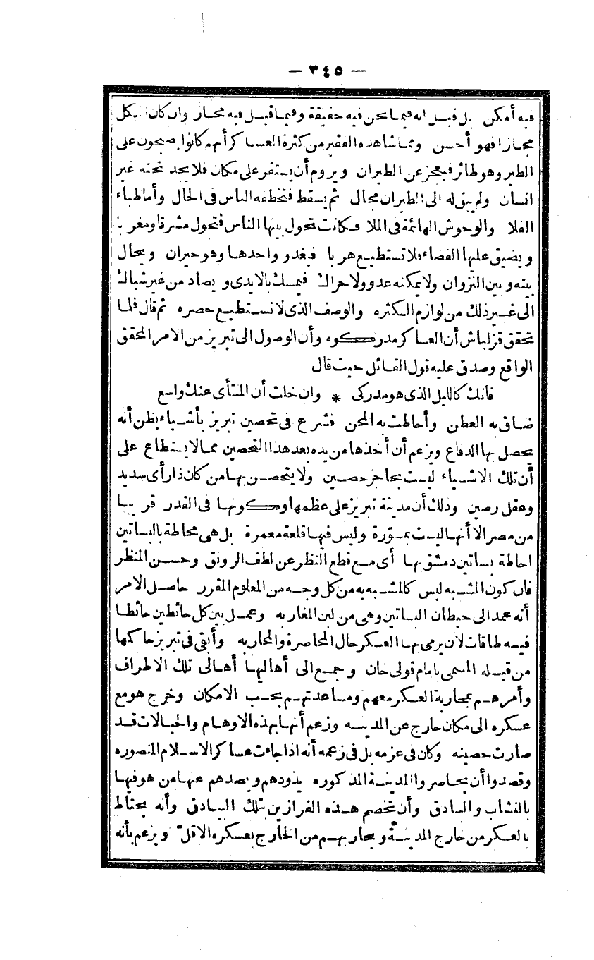 ضَاقَ بِهِ العطن وأحاطت بِهِ المحن فشرع فى تحصين تبريز بأَشْيَاء يظنّ أَنه يحصل بهَا الدفاع وَيَزْعُم أَن أَخذهَا من يَده بعد هَذَا التحصين مِمَّا لَا يُسْتَطَاع على أَن تِلْكَ الاشياء لَيست بحاجز حُصَيْن وَلَا يتحصن بهَا من كَانَ ذَا رَأْي سديد وعقل رصين وَذَلِكَ أَن مَدِينَة تبريز على عظمها وَكَونهَا فى الْقدر قَرِيبا من مصر الا أَنَّهَا لَيست بمسورة وَلَيْسَ فِيهَا قلعة معمرة بل هى محاطة بالبساتين احاطة بساتين دمشق بهَا أى مَعَ قطع النّظر عَن لطف الرونق وَحسن المنظر فان كَون الْمُشبه لَيْسَ كالمشبه بِهِ من كل وَجه من الْمَعْلُوم الْمُقَرّر حَاصِل الامر أَنه عمد الى حيطان الْبَسَاتِين وهى من لبن المغاربه وَعمل بَين كل حائطين حَائِطا فِيهِ طاقات لَان يرْمى بهَا الْعَسْكَر حَال المحاصرة والمحاربه وَأبقى فى تبريز حاكمها من قبله الْمُسَمّى بامام قولى خَان وَجمع الى اهاليها تِلْكَ الاطراف وَأمرهمْ بمحاربة الْعَسْكَر مَعَهم ومساعدتهم بِحَسب الامكان وَخرج هُوَ مَعَ عسكره الى مَكَان خَارج عَن الْمَدِينَة وَزعم أَنَّهَا بِهَذِهِ الاوهام والخيالات قد صَارَت حصينه وَكَانَ فى عزمه بل فى زَعمه أَنه اذا جَاءَت عَسَاكِر الاسلام المنصوره وقصدوا أَن يحاصروا الْمَدِينَة المذكوره يذودهم ويصدهم عَنْهَا من هُوَ فِيهَا بالنشاب والبنادق وَأَن تخصم هَذِه الفرازين بِتِلْكَ البيادق وَأَنه يحْتَاط بالعسكر من خَارج الْمَدِينَة ويحاربهم من الْخَارِج بعسكره الاقل وَيَزْعُم بِأَنَّهُ