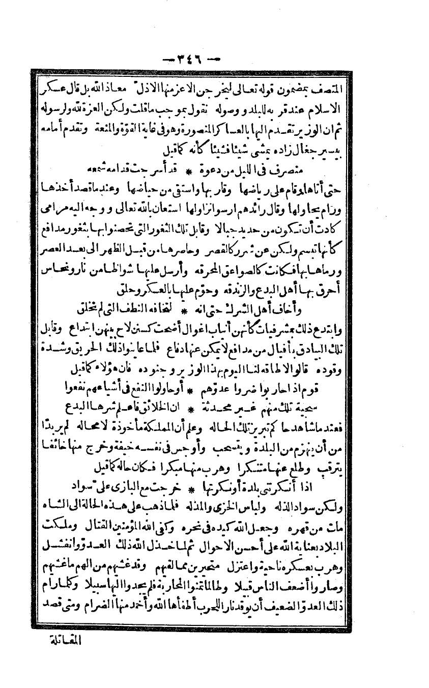 المتصف بمضمون قَوْله تَعَالَى {ليخرجن الْأَعَز مِنْهَا الْأَذَل} معَاذًا الله بل قَالَ عَسْكَر الاسلام عِنْد قربه للبلد ووصوله نقُول بِمُوجب مَا قلت وَلَكِن الْعِزَّة لله وَلِرَسُولِهِ ثمَّ ان الْوَزير تقدم اليها بالعساكر المنصورة وَهُوَ فى غَايَة الْقُوَّة والمنعة وَتقدم أَمَامه بِيَسِير جغال زَاده يمشى شَيْئا فَشَيْئًا كَأَنَّهُ كَمَا قيل
