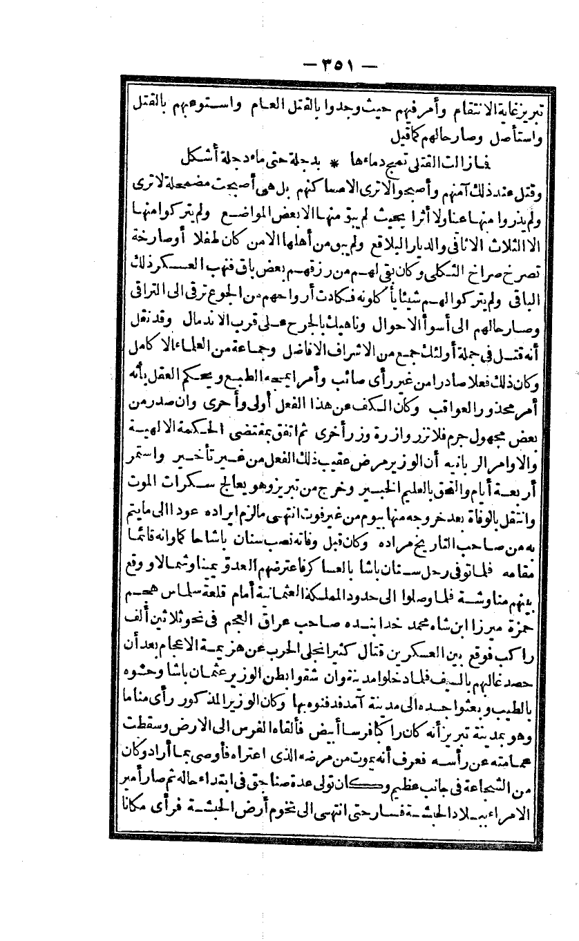 وَقتل عِنْد ذَلِك آمنهم وَأَصْبحُوا لَا ترى الا مساكنهم بل هى أَصبَحت مضمحلة لَا ترى وَلم يذروا مِنْهَا عينا وَلَا أثرا بِحَيْثُ لم يبْق مِنْهَا الا بعض الْمَوَاضِع وَلم يتْركُوا مِنْهَا الا الثَّلَاث الاثافى والديار البلاقع وَلم يبْق من أَهلهَا الا من كَانَ طفْلا أَو صارخة تصرخ صُرَاخ الثكلى وَكَانَ بقى لَهُم من رزقهم بعض بَاقٍ فنهب الْعَسْكَر ذَلِك الباقى وَلم يتْركُوا لَهُم شَيْئا يَأْكُلُونَهُ فَكَادَتْ أَرْوَاحهم من الْجُوع ترقى الى التراقى وَصَارَ حَالهم الى أَسْوَأ الاحوال وناهيك بِالْجرْحِ على قرب الِانْدِمَال وَقد نقل أَنه قتل فى جملَة أُولَئِكَ جمع من الاشراف الافاضل وَجَمَاعَة من الْعلمَاء الاكامل وَكَانَ ذَلِك فعلا صادرا من غير رأى صائب وأمرا يمجه الطَّبْع وَيحكم الْعقل بِأَنَّهُ أَمر مَحْذُور العواقب وَكَانَ الْكَفّ عَن هَذَا الْفِعْل أولى وَأَحْرَى وان صدر من بعض مَجْهُول جرم فَلَا تزر وَازِرَة وزرة أُخْرَى ثمَّ اتّفق بِمُقْتَضى الْحِكْمَة الالهية والاوامر الربانيه أَن الْوَزير مرض عقيب ذَلِك الْفِعْل من غير تَأْخِير وَاسْتمرّ أَرْبَعَة أَيَّام والتحق بالعليم الْخَبِير وَخرج من تبريز وَهُوَ يعالج سَكَرَات الْمَوْت وانتقل بالوفاة بعد خُرُوجه مِنْهَا بِيَوْم من غير فَوت انْتهى مَا لزم ايراده عودا الى مَا يتم بِهِ من صَاحب التَّارِيخ مُرَاده وَكَانَ قبل وَفَاته نصب سِنَان باشا حَاكما وانه قَائِما مقَامه فَلَمَّا توفى رَحل سِنَان باشا بالعساكر فاعترضهم الْعَدو يَمِينا وَشمَالًا وَوَقع بَينهم مناوشة فَلَمَّا وصلوا الى حُدُود المملكة العثمانية أَمَام قلعة سلماس هجم حَمْزَة ميرزا ابْن شاه مُحَمَّد خدا بنده صَاحب عراق الْعَجم فى نَحْو ثَلَاثِينَ ألف رَاكب فَوَقع بَين العسكرين قتال كثير انجلى الْحَرْب عَن هزيمَة الاعجام بعد أَن حصد غالبهم بِالسَّيْفِ فَلَمَّا دخلُوا مَدِينَة وان شَقوا بطن الْوَزير عُثْمَان باشا وحشوه بالطيب وبعثوا جده الى مَدِينَة آمد فدفنوه بهَا وَكَانَ الْوَزير الْمَذْكُور رأى مناما وَهُوَ بِمَدِينَة تبريز أَنه كَانَ رَاكِبًا فرسا أَبيض فَأَلْقَاهُ الْفرس الى الارض وَسَقَطت عمَامَته عَن رَأسه فَعرف أَنه يَمُوت من مَرضه الذى اعتراه فأوصى بِمَا أَرَادَ وَكَانَ من الشجَاعَة فى جَانب عَظِيم وَكَانَ تولى عدَّة صناجق فى ابْتِدَاء حَاله ثمَّ صَار أَمِير الامراء بِبِلَاد الْحَبَشَة فَسَار حَتَّى انْتهى الى تخوم أَرض الْحَبَشَة فَرَأى مَكَانا