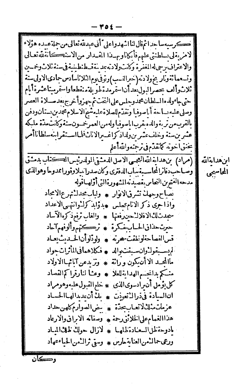 مُرَاد بن هِدَايَة الله العجمى الاصل الدمشقى المولد رَئِيس الْكتاب بِدِمَشْق وَصَاحب دفاتر المحاسبة بِبَاب الدفترى وَكَانَ صَدرا نبيلا وقورا ممدوحا وَهُوَ الذى مدحه الْفَتْح بن النّحاس بقصيدته الْمَشْهُورَة الَّتِى أَولهَا قَوْله
