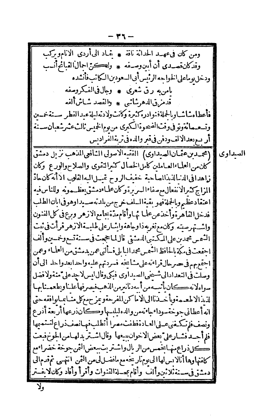 مُحَمَّد بن عُثْمَان الصيداوى الْفَقِيه الاصولى الشافعى الْمَذْهَب نزيل دمشق كَانَ من الْعلمَاء العاملين كَامِل الْخِصَال كثير التَّقْوَى وَالصَّلَاح والورع وَكَانَ زاهدا فى الدُّنْيَا لذيذا المصاحبة خَفِيف الرّوح تميل اليه الْقُلُوب الا أَنه كَانَ حاد المزاج كثير الانفعال مَعَ صفاء السريرة وَكَانَ عُلَمَاء دمشق يعظمونه وَلِلنَّاسِ فِيهِ اعْتِقَاد عَظِيم وَبِالْجُمْلَةِ فَهُوَ بَقِيَّة السّلف خرج من بلدته صيدا وَهُوَ فى ابان الطّلب فَدخل الْقَاهِرَة وَأخذ عَن علمائها وَأقَام مُدَّة بِجَامِع الازهر وبرع فى كل الْفُنُون واشتهر صيته وَكَانَ مَعَ تغربه ذَا وجاهة وايثار على طلبة الازهر قَرَأت فى ثَبت الشَّمْس مُحَمَّد بن على المكتبى الدمشقى قَالَ لما حججْت فى سنة تسع وَخمسين وَألف اجْتمعت فى مَكَّة بِالْحَافِظِ الشَّمْس مُحَمَّد البابلى فسألنى عمر بِدِمَشْق من الْعلمَاء وَعَمن اجْتمع فى مصر حَال قِرَاءَته على مشايخه فسردتهم عَلَيْهِ وَاحِد بعد وَاحِد الى أَن وصلت فى التعداد الى شيخى الصيداوى فَبكى وَقَالَ لَيْسَ لَاحَدَّ على منَّة وَلَا فضل سواهُ لانه كَانَ يَأْتِيهِ من أَبِيه دَنَانِير من الذَّهَب فيصرفها علينا ويطعمنا بهَا لذيذ الاطعمة وَيَأْخُذ الى الاماكن المفرحة ويمزح مَعَ كل منا بِمَا يُوَافقهُ حَتَّى انه أعطانى جوخة سَوْدَاء جَاءَتْهُ من وَالِده ليلبسها وَكَانَ ذرعها أَرْبَعَة أَذْرع وَنصف فَلم تكفنى على الْعَادة فطفت مصرا أتطلب فِيهَا نصف ذِرَاع لتتميمها فَلم أجد فشار على بعض الاخوان بِبَيْعِهَا وَقَالَ اشْتَرِ بدلهَا من الجوخ فَبِعْت كل ذارع مِنْهَا بِخمْس من الريال واشتريت بِبَعْض الثّمن جوخة خضراء مَعَ كافتها وَهَا أَنا لابس لَهَا الى يَوْم تَارِيخه مَعَ مَا فضل لى من الثّمن انْتهى ثمَّ قدم الى دمشق فى سنة ثَلَاثِينَ وَألف وَأقَام بمحلة القنوات وأقرأ وَأفَاد وَكَانَ لَا يفتر