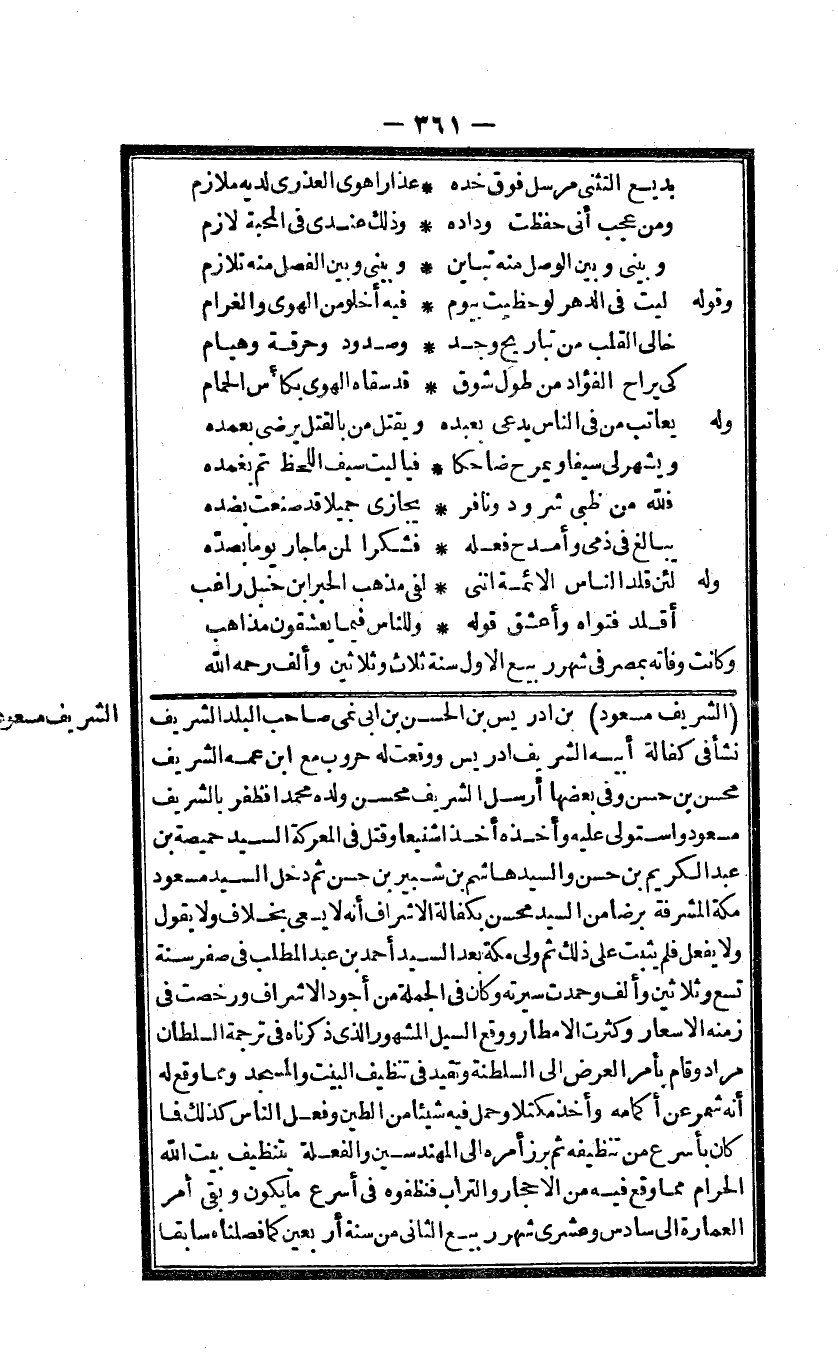 الشريف مَسْعُود بن ادريس بن الْحسن بن ابى نمى صَاحب الْبَلَد الشريف نَشأ فى كَفَالَة أَبِيه الشريف ادريس وَوَقعت لَهُ حروب مَعَ ابْن عَمه الشريف محسن بن حسن وفى بَعْضهَا أرسل الشريف محسن وَلَده مُحَمَّدًا فظفر بالشريف مَسْعُود وَاسْتولى عَلَيْهِ وَأَخذه أخذا سنيعا وَقتل فى المعركة السَّيِّد حميصة بن عبد الْكَرِيم بن حسن وَالسَّيِّد هَاشم بن شبير بن حسن ثمَّ دخل السَّيِّد مَسْعُود مَكَّة المشرفة بِرِضا من السَّيِّد محسن بكفالة الاشراف أَنه لَا يسْعَى بِخِلَاف وَلَا يَقُول وَلَا يفعل فَلم يثبت على ذَلِك ثمَّ ولى مَكَّة بعد السَّيِّد أَحْمد بن عبد الْمطلب فى صفر سنة تسع وَثَلَاثِينَ وَألف وحمدت سيرته وَكَانَ فى الْجُمْلَة من أَجود الاشراف ورخصت فى زَمَنه الاسعار وَكَثُرت الامطار وَوَقع السَّيْل الْمَشْهُور الذى ذَكرْنَاهُ فى تَرْجَمَة السُّلْطَان مُرَاد وَقَامَ بِأَمْر الْعرض الى السلطنة وتقيد فى تنظيف الْبَيْت وَالْمَسْجِد وَمِمَّا وَقع لَهُ أَنه شمر عَن أكمامه وَأخذ مكتلا وَحمل فِيهِ شَيْئا من الطين وَفعل النَّاس كَذَلِك فَمَا كَانَ بأسرع من تنظيمه ثمَّ برز أمره الى المهندسين والفعلة بتنظيف بَيت الله الْحَرَام مِمَّا وَقع فِيهِ من الاحجار وَالتُّرَاب فنظفوه فى أسْرع مَا يكون وبقى أَمر الْعِمَارَة الى سادس وعشرى شهر ربيع الثانى من سنة أَرْبَعِينَ كَمَا فصلناه سَابِقًا