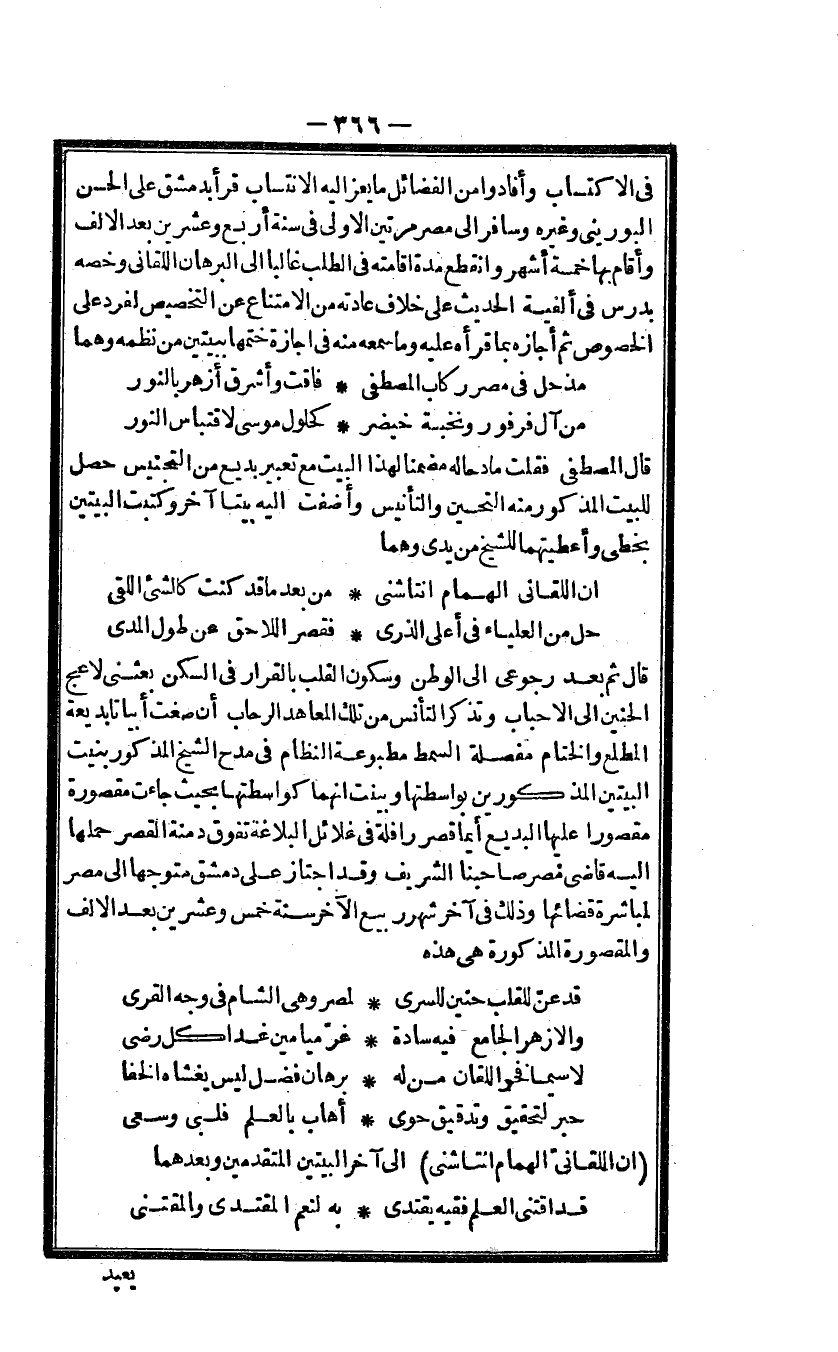 قَالَ ثمَّ بعد رجوعى الى الوطن وَسُكُون الْقلب بالقرار فى السكن بعثنى لاعج الحنين الى الاحباب وتذكر التأنس من تِلْكَ الْمعَاهد الرحاب أَن صغت أبيانا بديعة المطلع والختام مفصلة السمط مطبوعة النظام فى مدح الشَّيْخ الْمَذْكُور بنيت الْبَيْتَيْنِ الْمَذْكُورين بواسطتها وبينت انهما كواسطتها بِحَيْثُ جَاءَت مَقْصُورَة مَقْصُورا عَلَيْهَا البديع أَيّمَا قصر رافلة فى غلائل البلاغة تفوق دمنة الْقصر حملهَا اليه قاضى مصر صاحبنا الشريف وَقد اجتاز على دمشق مُتَوَجها الى مصر لمباشرة قَضَائهَا وَذَلِكَ فى آخر شهر ربيع الآخر سنة خمس وَعشْرين بعد الالف والمقصورة الْمَذْكُورَة هى هَذِه