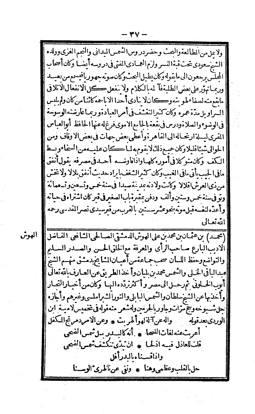 مُحَمَّد بن عُثْمَان بن مُحَمَّد بن على الهوش الدمشقى الصالحى الشافعى الْفَاضِل الاديب البارع صَاحب الرأى والمعرفة مَعَ الْخلق الْحسن والصدر السَّلِيم والتواضع وَحفظ اللِّسَان صحب جمَاعَة من أَعْيَان الْمَشَايِخ بِدِمَشْق مِنْهُم الشَّيْخ عبد الباقى الحنبلى وَالشَّمْس مُحَمَّد بن بليان وَأخذ الطَّرِيق عَن الْعَارِف بِاللَّه تَعَالَى أَيُّوب الخلوتى ثمَّ رَحل الى مصر وَأكْثر تردده اليها وَكَانَ من أخيار التُّجَّار وَأخذ بهَا عَن الشَّيْخ سُلْطَان وَالشَّمْس البابلى والنور الشبراملسى وَغَيرهم وَأَجَازَهُ جلّ شُيُوخه وَحج مَرَّات وجاور بالحرمين وَله شعر مِنْهُ قَوْله فى تخميس لامية ابْن الوردى بعد قَوْله