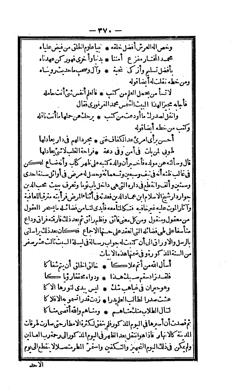 قَالَ وَسَأَلته عَن مولده فَأخْبر أَن وَالِده كتبه على ظهر كتاب وَأَنه ضَاعَ لَكِن فى غَالب ظَنّه أَنه فى نَيف وَسبعين وَتِسْعمِائَة وَحصل لَهُ مرض فى أَوَائِل سنة احدى وَسِتِّينَ وَألف وَانْقطع فى دَاره الَّتِى هى دَاخل بَاب توما وتعرف بِبَيْت محب الدّين جوَار دَار شيخ الاسلام ابْن عماد الدّين فعدته فى أثْنَاء الْمَرَض فرأيته مترقبا للعافية وآثار الْمَوْت عَلَيْهِ غير خافيه فتكالمنا مَعَه فأبدى لنا من فضائله مَا يسحر الْعُقُول من مَعْقُول ومنقول وَمن كل معنى فائق ونظم رائق ثمَّ بعد ذَلِك فارقته فِرَاق وداع متأسفا على طى فضائله الَّتِى انْعَقَد على حسنها الاجماع فَكَانَ بعد ذَلِك يراسلنى بالرسل والاوراق الى أَن كتبت لَهُ جَوَاب رِسَالَة فى لَيْلَة السبت ثَالِث عشر صفر من السّنة الْمَذْكُورَة وفى ضمنهَا هَذِه الابيات