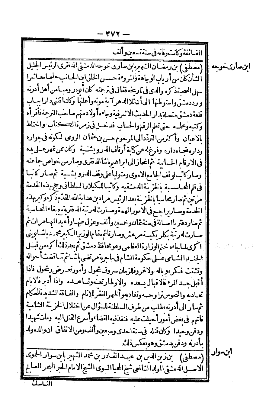 مصطفى بن زين الدّين بن عبد الْقَادِر بن مُحَمَّد الشهير بِابْن سوار الحموى الاصل الدمشقى المولد الشافعى شيخ الْمحيا النبوى الامام الحبر الْبَحْر الصَّالح