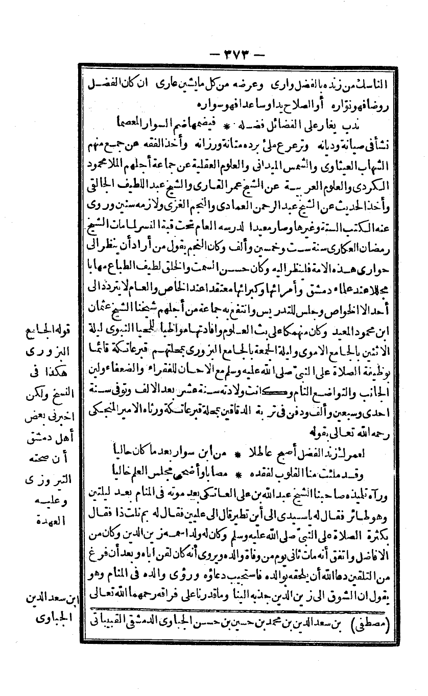 مَعَ الاحسان للْفُقَرَاء والضعفاء ولين الْجَانِب والتواضع التَّام وَكَانَت وِلَادَته سنة عشر بعد الالف وَتوفى سنة احدى وَسبعين وَألف وَدفن فى تربة الدقاقين بمحلة قبر عَاتِكَة ورثاه الامير المنجكى رَحمَه الله تَعَالَى بقوله