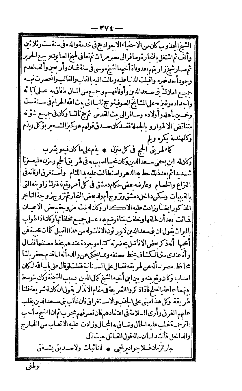 الشَّيْخ المجذوب كَانَ من الاسخياء الاجواد حج فى خدمَة وَالِده فى سنة سِتّ وَثَلَاثِينَ وَألف ثمَّ اشْتغل بِالتِّجَارَة وسافر الى مصر مَرَّات ثمَّ تعانى طبخ الصابون وَبيع الْحَرِير ثمَّ صَار شيخ زاويتهم بعد وَفَاة أَخِيه الشَّيْخ مُوسَى فى سنة ثَمَان وَأَرْبَعين وَألف لعدم وجود أحد غَيره واقبلت الدُّنْيَا عَلَيْهِ ومالت اليه بِالْقَلْبِ والقالب وانحصرت فِيهِ جَمِيع املاك بنى سعد الدّين وأوقافهم وَجمع من المَال مَا فاق بِهِ على آبَائِهِ واجداده وتميز بِهِ على الْمَشَايِخ الصُّوفِيَّة وَحج ثَانِيًا الى بَيت الله الْحَرَام فى سنة سِتّ وَخمسين بأَهْله وَأَوْلَاده وسافر الى بَيت الْمُقَدّس ثمَّ حج ثَالِثا وَكَانَ فى جَمِيع شؤنه متناقض الاطوار وَبِالْجُمْلَةِ فقد كَانَ صدق قَوْلهم هُوَ كخبز الشّعير يُؤْكَل ويذم وكالهندية يكره ويلم