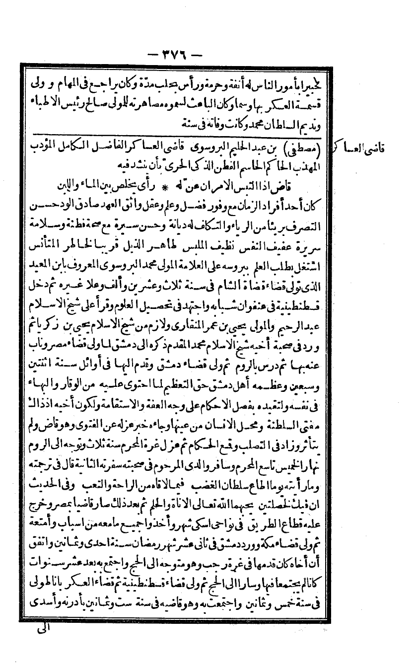 مصطفى بن عبد الْحَلِيم البروسوى قاضى العساكر الْفَاضِل الْكَامِل الْمُؤَدب الْمُهَذّب الْحَاكِم الحاسم الفطن الذكى الحرى بِأَن ينشد فِيهِ