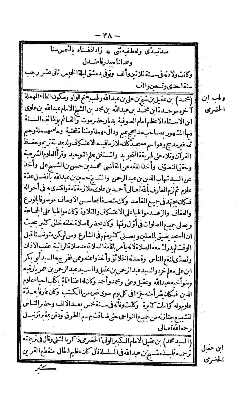 مُحَمَّد بن عقيل بن شيخ بن على بن عبد الله وطب بِفَتْح الْوَاو وَسُكُون الطَّاء الْمُهْملَة آخِره مُوَحدَة ابْن مُحَمَّد بن عبد الله بن مُحَمَّد بن الشَّيْخ الامام عبد الله بن علوى ابْن الاستاذ الاعظم امام الصُّوفِيَّة بديار حضر موت والقائم بوظائف السّنة فِيهَا الْمَشْهُور بِصَاحِب مديحج بميم ودال مُهْملَة ومثناة تحتية وحاء مُهْملَة وجيم تَصْغِير مدحج وَهُوَ اسْم مَسْجِد كَانَ ملازما فِيهِ الِاعْتِكَاف ولد بِمَدِينَة تريم وَحفظ الْقُرْآن وتلاه على طَريقَة التجويد واشتغل بِعلم التَّوْحِيد وَقَرَأَ الْعُلُوم الشَّرْعِيَّة وحقق التصوف وَأخذ الْفِقْه عَن القاضى محمدبن حسن بن الشَّيْخ على وَأخذ عَن السَّيِّد شهَاب الدّين عبد الرَّحْمَن وَالشَّيْخ حُسَيْن بن عبد الله بَافضل عدَّة عُلُوم ثمَّ لزم الْعَارِف بِاللَّه تَعَالَى أَحْمد بن علوى مُلَازمَة تَامَّة واقتدى بِهِ فى أَحْوَاله فَكَانَ يجْتَهد فى جَمِيع الْمَقَاصِد وَكَانَ متصفا بمحاسن الاوصاف مَوْصُوفا بالورع والعفاف والزهد مواظبا على الِاعْتِكَاف والتلاوة وَكَانَ مواظبا على الْجَمَاعَة وَصلى جَمِيع الصَّلَوَات فى أول وَقتهَا وَكَانَ يحضر للصَّلَاة خَلفه خلق كثير بِحَيْثُ ان الْمَسْجِد يضيق بالمصلين وَيصلى كثير مِنْهُم فى الشَّارِع وَمن لم يكن متوضئا قبل الْوَقْت لم يدْرك مَعَه الصَّلَاة لانه يَأْمر باقامة الصَّلَاة بعد صَلَاة الرَّاتِبَة عقب الاذان وتصدى لنفع النَّاس وقصدته الْخَلَائق وَأخذُوا عَنهُ وَمِمَّنْ تخرج بِهِ السَّيِّد أَبُو بكر ابْن على معلم خرد وَالسَّيِّد عبد الرَّحْمَن بن عقيل وَالسَّيِّد عبد الرَّحْمَن بن عمر بارقيه وَبَنُو أَخِيه عبد الله وَعقيل وعَلى وَمُحَمّد وَأحمد وَكَانَ لَهُ اعتناء تَامّ بِكِتَاب احياء عُلُوم الدّين فَكَانَ يقْرَأ مِنْهُ جُزْءا فى كل يَوْم سوى غَيره من الْكتب وَكَانَ عَارِفًا بعدة عُلُوم وَله كرامات كَثِيرَة وَكَانَت وَفَاته فى سنة خمس بعد الالف وَحضر النَّاس لتشييع جنَازَته من جَمِيع النواحى حَتَّى ضَاقَتْ بهم الطّرق وَدفن بمقبرة زنبل رَحمَه الله تَعَالَى