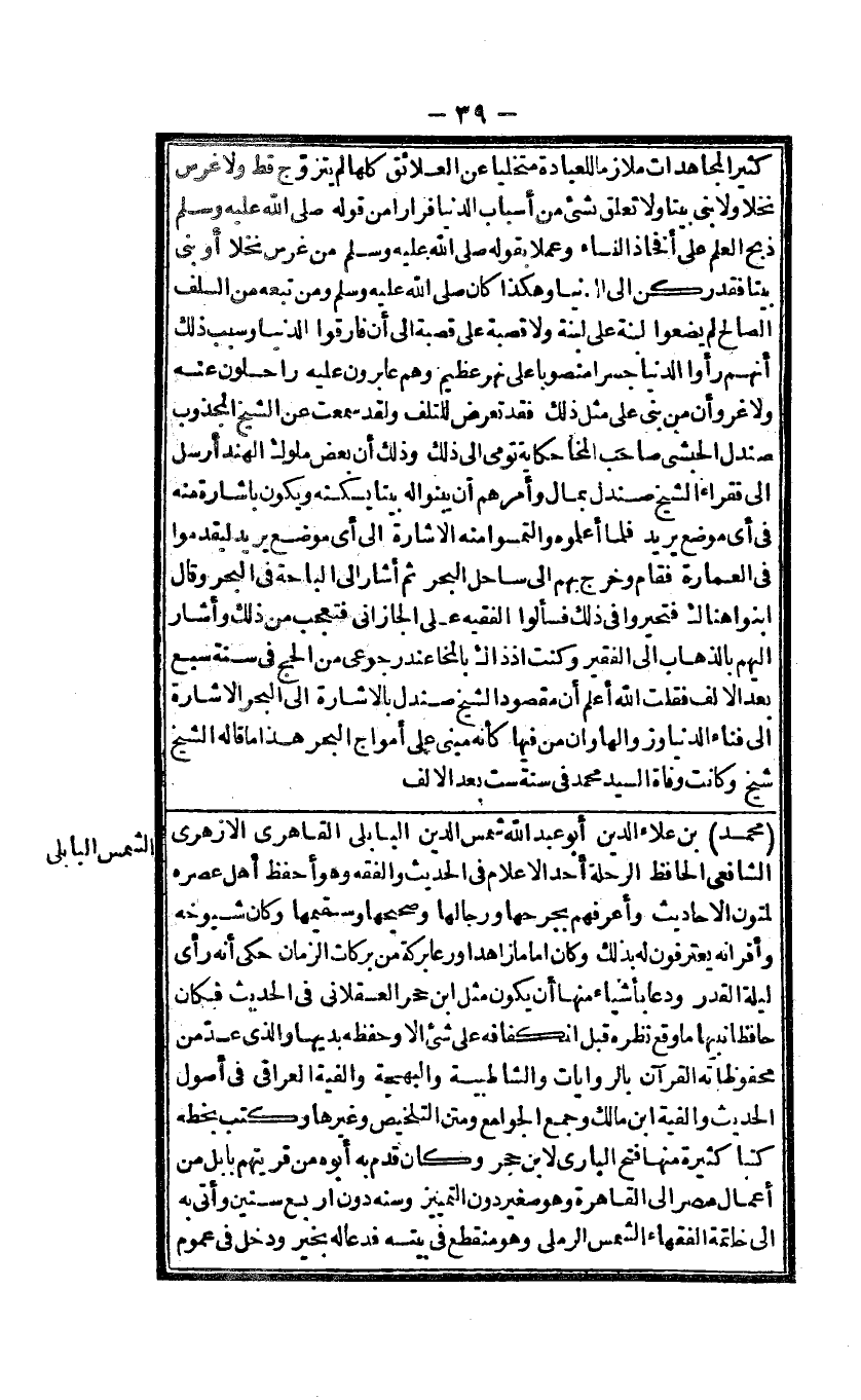 مُحَمَّد بن عَلَاء الدّين أَبُو عبد الله شمس الدّين البابلى القاهرى الازهرى الشافعى الْحَافِظ الرحلة أحد الاعلام فى الحَدِيث وَالْفِقْه وَهُوَ أحفظ أهل عصره لمتون الاحاديث وأعرفهم بجرحها ورجالها وصحيحها وسقيمها وَكَانَ شُيُوخه وأقرانه يعترفون لَهُ بذلك وَكَانَ اماما زاهدا ورعا بركَة من بَرَكَات الزَّمَان حكى أَنه رأى لَيْلَة الْقدر ودعا بأَشْيَاء مِنْهَا أَن يكون مثل ابْن حجر العسقلانى فى الحَدِيث فَكَانَ حَافِظًا نبيها مَا وَقع نظره قبل انكفافه على شئ الا وَحفظه بديها والذى عد من محفوظاته الْقُرْآن بالروايات والشاطبية والبهجة والفية العراقى فى أصُول الحَدِيث والفيه ابْن مَالك وَجمع الْجَوَامِع وَمتْن التَّلْخِيص وَغَيرهَا وَكتب بِخَطِّهِ كتبا كَثِيرَة مِنْهَا فتح البارى لِابْنِ حجر وَكَانَ قدم بِهِ؟ أَبوهُ من قريتهم بابل من أَعمال مصر الى الْقَاهِرَة وَهُوَ صَغِير دون التَّمْيِيز وسنه دون ارْبَعْ سِنِين وأتى بِهِ الى خَاتِمَة الْفُقَهَاء الشَّمْس الرملى وَهُوَ مُنْقَطع فى بَيته فَدَعَا لَهُ بِخَير وَدخل فى عُمُوم