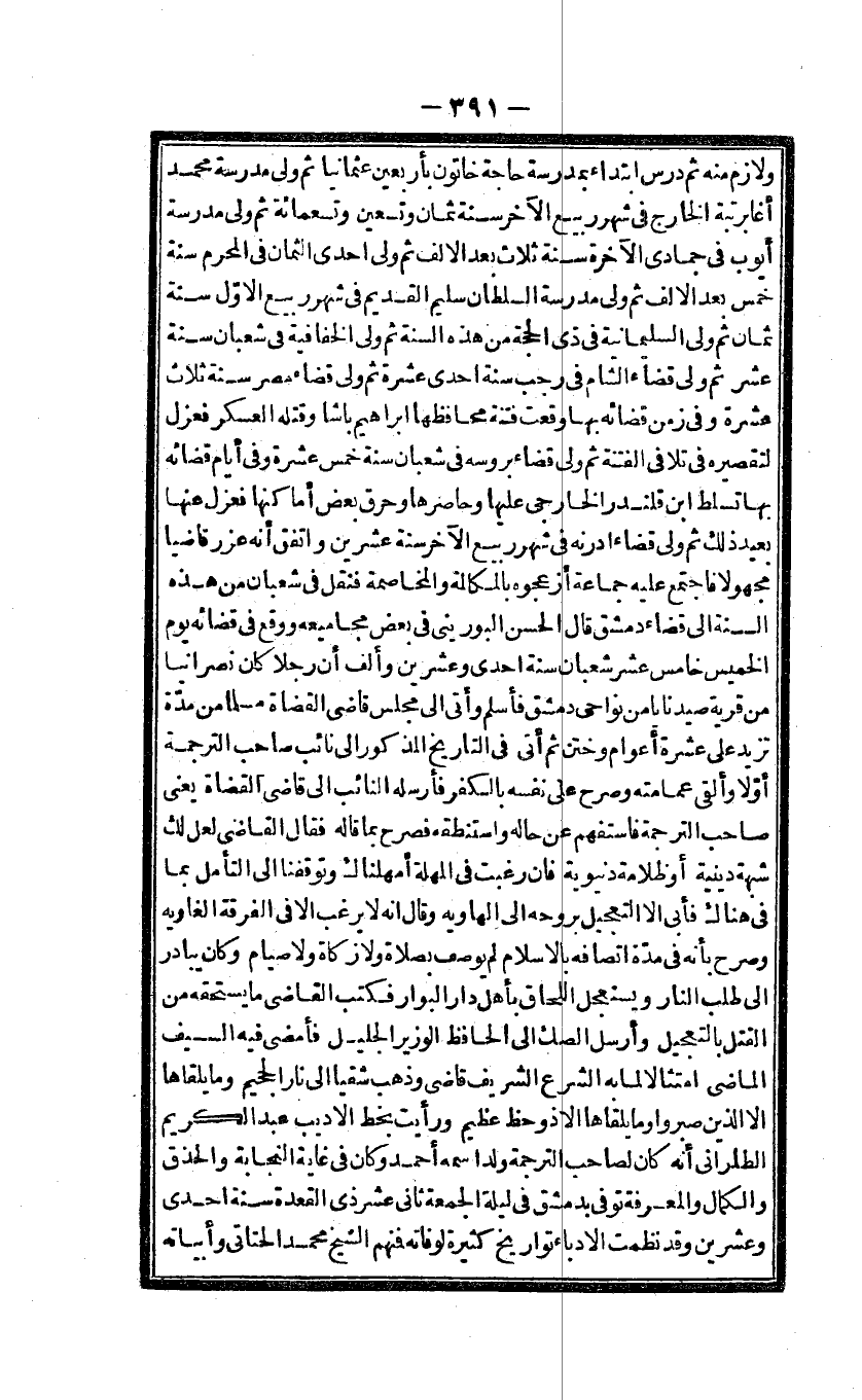 ولازم مِنْهُ ثمَّ درس ابْتِدَاء بمدرسة حَاجَة خاتون بِأَرْبَعِينَ عثمانيا ثمَّ ولى مدرسة مُحَمَّد أغا برتبة الْخَارِج فى شهر بيع الْآخِرَة سنة ثَمَان وَتِسْعين وَتِسْعمِائَة ثمَّ ولى مدرسة أَيُّوب فى جُمَادَى الْآخِرَة سنة ثَلَاث بعد الالف ثمَّ ولى احدى الثمان فى الْمحرم سنة خمس بعد الالف ثمَّ ولى مدرسة السُّلْطَان سليم الْقَدِيم فى شهر ربيع الاول سنة ثَمَان ثمَّ ولى السليمانية فى ذى الْحجَّة من هَذِه السّنة ثمَّ ولى الخفافية فى شعْبَان سنة عشر ثمَّ ولى قَضَاء الشَّام فى رَجَب سنة احدى عشرَة ثمَّ ولى قَضَاء مصر سنة ثَلَاث عشرَة وفى زمن قَضَائِهِ بهَا وَقعت فتْنَة محافظها ابراهيم باشا وَقَتله الْعَسْكَر فعزل لتَقْصِيره فى تلافى الْفِتْنَة ثمَّ ولى قَضَاء بروسه فى شعْبَان سنة خمس عشرَة وفى أَيَّام قَضَائِهِ بهَا تسلط ابْن قلندر الخارجى عَلَيْهَا وحاصرها وَحرق بعض اماكنها فعزل عَنْهَا بعيد ذَلِك ثمَّ ولى قَضَاء ادرنه فى شهر ربيع الآخر سنة عشْرين وَاتفقَ أَنه عزّر قَاضِيا مَجْهُولا فَاجْتمع عَلَيْهِ جمَاعَة أزعجوه بالمكالمة والمخاصمة فَنقل فى شعْبَان من هَذِه السّنة الى قَضَاء دمشق قَالَ الْحسن البوريني فى بعض مجاميعه وَوَقع فى قَضَائِهِ يَوْم الْخَمِيس خَامِس عشر شعْبَان سنة احدى وَعشْرين وَألف أَن رجلا كَانَ نَصْرَانِيّا قَرْيَة صيدنايا من نواحى دمشق فَأسلم وأتى الى مجْلِس قاضى الْقُضَاة مُسلما من مُدَّة تزيد على عشرَة أَعْوَام وختن ثمَّ أَتَى فى التَّارِيخ الْمَذْكُور الى نَائِب صَاحب التَّرْجَمَة أَولا وَألقى عمَامَته وَصرح على نَفسه بالْكفْر فارسله النَّائِب الى قاضى الْقُضَاة يعْنى صَاحب التَّرْجَمَة فاستفهم عَن حَاله واستنطقه فَصرحَ بِمَا قَالَه فَقَالَ القاضى لَعَلَّ لَك شُبْهَة دينية أَو ظلامة دنيوية فان رغبت فى المهلة أمهلناك وتوقفنا الى التَّأَمُّل بِمَا فى هُنَاكَ فَأبى الا التعجيب بِرُوحِهِ الى الهاويه وَقَالَ انه لَا يرغب الا فى الْفرْقَة الغاويه وَصرح بِأَنَّهُ فى مُدَّة اتصافه بالاسلام لم يُوصف بِصَلَاة وَلَا زَكَاة وَلَا صِيَام وَكَانَ يُبَادر الى طلب النَّار ويستعجل اللحاق بِأَهْل دَار الْبَوَار فَكتب القاضى مَا يسْتَحقّهُ من الْقَتْل بالتعجيل وَأرْسل الصَّك الى الْحَافِظ الْوَزير الْجَلِيل فَأمْضى فِيهِ السَّيْف الماضى امتثالا لما بِهِ الشَّرْع الشريف قاضى وَذهب شقيا الى نَار الْجَحِيم وَمَا يلقاها الا الَّذين صَبَرُوا وَمَا يلقاها الا ذُو حَظّ عَظِيم وَرَأَيْت بِخَط الاديب عبد الْكَرِيم الطارانى أَنه كَانَ لصَاحب التَّرْجَمَة ولد اسْمه أَحْمد وَكَانَ فى غَايَة النجابة والحذق والكمال والمعرفة توفى بِدِمَشْق فى لَيْلَة الْجُمُعَة ثانى عشر ذى الْقعدَة سنة احدى وَعشْرين وَقد نظمت الادباء تواريخ كَثِيرَة لوفاته فَمنهمْ الشَّيْخ مُحَمَّد الحتاتى وأبياته