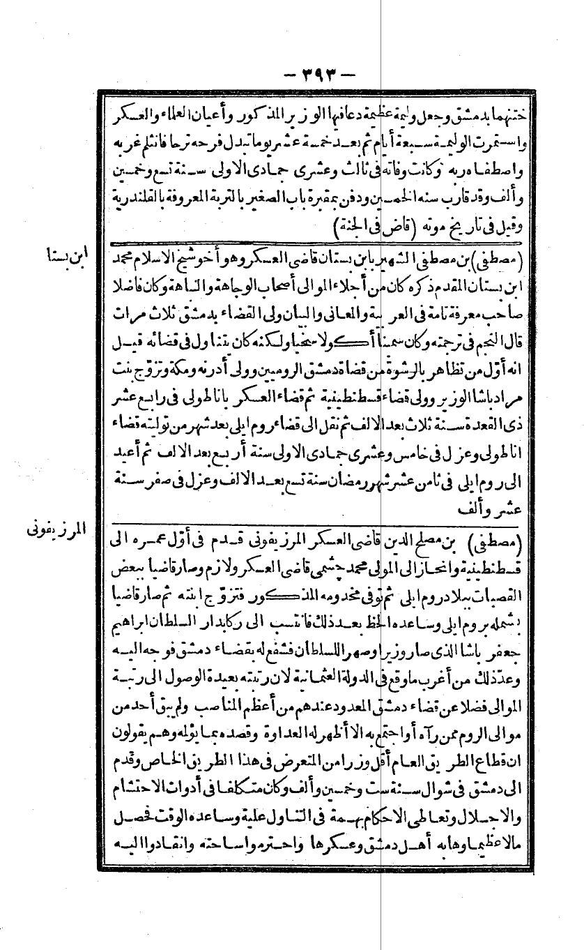 مصطفى بن مصطفى الشهير بِابْن بُسْتَان قاضى الْعَسْكَر وَهُوَ أَخُو شيخ الاسلام مُحَمَّد ابْن بُسْتَان الْمُقدم ذكره وَكَانَ من أجلاء الموالى أَصْحَاب الوجاهة والنباهة وَكَانَ فَاضلا صَاحب معرفَة تَامَّة فى الْعَرَبيَّة والمعانى وَالْبَيَان ولى الْقَضَاء بِدِمَشْق ثَلَاث مَرَّات قَالَ النَّجْم فى تَرْجَمته وَكَانَ سمينا أكولا سخيا وَلكنه كَانَ يتَنَاوَل فى قَضَائِهِ قيل انه أول من تظاهر بالرشوة من قُضَاة دمشق الروميين وَولى أدرنه وَمَكَّة وَتزَوج بنت مُرَاد باشا الْوَزير وَولى قَضَاء قسطنطينية ثمَّ قَضَاء الْعَسْكَر باناطولى فى رَابِع عشر ذى الْقعدَة سنة ثَلَاث بعد الالف ثمَّ نقل الى قَضَاء روم ايلى بعد شهر من تَوليته قَضَاء اناطولى وعزل فى خَامِس وعشرى جُمَادَى الاولى سنة أَربع بعد الالف ثمَّ أُعِيد الى روم ايلى فى ثامن عشر شهر رَمَضَان سنة تسع بعد الالف وعزل فى صفر سنة عشر وَألف