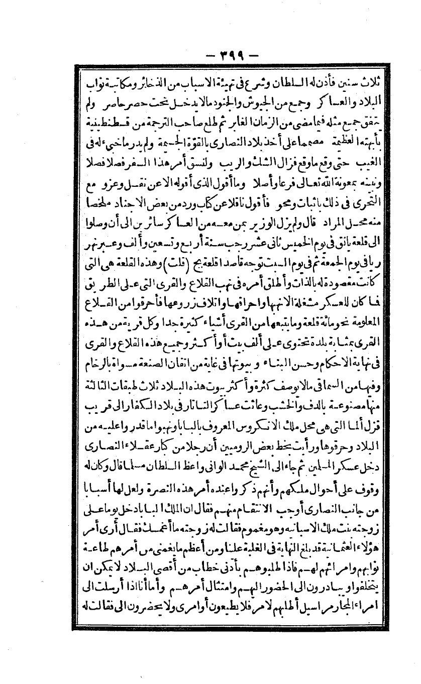 ثَلَاث سِنِين فَأذن لَهُ السُّلْطَان وَشرع فى تهيئة الاسباب من الذَّخَائِر ومكاتبة نواب الْبِلَاد والعساكر وَجمع من الجيوش والجنود مَا لَا يدْخل تَحت حصر حاصر وَلم يتَّفق جَمِيع مثله فِيمَا مضى من الزَّمَان الغابر ثمَّ طلع صَاحب التَّرْجَمَة من قسطنطينية بأبهته الْعَظِيمَة مصمما على أَخذ بِلَاد النَّصَارَى بِالْقُوَّةِ الجسيمة وَلم يدر مَا خبئ لَهُ فى الْغَيْب حَتَّى وَقع مَا وَقع فَزَالَ الشَّك والريب ولنسق أَمر هَذَا السّفر فصلا فصلا ونبينه بمعونة الله تَعَالَى فرعا وأصلا وَمَا أَقُول الذى أقوله الا عَن نقل وعزو مَعَ التحرى فى ذَلِك باثبات ومحو فَأَقُول نَاقِلا عَن كتاب ورد من بعض الاجناد مُلَخصا مِنْهُ مَحل المُرَاد قَالَ وَلم يزل الْوَزير بِمن مَعَه من العساكر سائرين الى أَن وصلوا الى قلعة يانق فى يَوْم الْخَمِيس ثانى عشر رَجَب سنة أَربع وَتِسْعين وَألف وَعبر نهر ريا فى يَوْم الْجُمُعَة ثمَّ فى يَوْم السبت توجه قَاصِدا قلعة بج قلت وَهَذِه القلعة هى الَّتِى كَانَت مَقْصُوده لَهُ بِالذَّاتِ وَأطلق أمره فى نهب القلاع والقرى الَّتِى على الطَّرِيق فَمَا كَانَ للعسكر مشغلة الا نهبها واحراقها واتلاف زروعها فأحرقوا من القلاع الْمَعْلُومَة نَحْو مائَة قلعة وَمَا يتبعهَا من الْقرى أَشْيَاء كَثِيرَة جدا وكل قَرْيَة من هَذِه الْقرى بِمَثَابَة بَلْدَة تحتوى على ألف بَيت أَو أَكثر وَجَمِيع هَذِه القلاع والقرى فى نِهَايَة الاحكام وَحسن الْبناء وبيوتها فى غَايَة من اتقان الصَّنْعَة مسواة بالرخام وفيهَا من السماقى مَالا يُوصف كَثْرَة وَأكْثر بيُوت هَذِه الْبِلَاد ثَلَاث طَبَقَات الثَّالِثَة مِنْهَا مصنوعة بالدف والخشب وعاثت عَسَاكِر التاتار فى بِلَاد الْكفَّار الى قريب فزل ألما الَّتِى هى مَحل ملك الانكروس الْمَعْرُوف بالبابا ونهبوا مَا قدرُوا عَلَيْهِ من الْبِلَاد وحرقوها وَرَأَيْت بِخَط بعض الروميين أَن رجلا من كبار عقلاء النَّصَارَى دخل عَسْكَر الْمُسلمين ثمَّ جَاءَ الى الشَّيْخ مُحَمَّد الوانى واعظ السُّلْطَان مُسلما قَالَ وَكَانَ لَهُ وقُوف على أَحْوَال ملكهم وَأَنَّهُمْ ذكرُوا عِنْده أَمر هَذِه النُّصْرَة وَلَعَلَّ لَهَا أسبابا من جَانب النَّصَارَى أوجب الانتقام مِنْهُم فَقَالَ ان الْملك البابا دخل يَوْمًا على زَوجته بنت ملك الاسبانية وَهُوَ مغموم فَقَالَ لَهُ زَوجته مَا أغمك فَقَالَ أرى أَمر هَؤُلَاءِ العثمانية قد بلغ النِّهَايَة فى الْغَلَبَة علينا وَمن أعظم مَا يغمنى من أَمرهم طَاعَة نوابهم وامرائهم لَهُم فاذا طلبوهم بِأَدْنَى خطاب من أقْصَى الْبِلَاد لَا يُمكن ان يتخلفوا ويبادرون الى الْحُضُور اليهم وامتثال أَمرهم وَأما أَنا اذا أرْسلت الى امراء المجار مَرَاسِيل أطلبهم لامر فَلَا يطيعون أوامرى وَلَا يحْضرُون الى فَقَالَت لَهُ