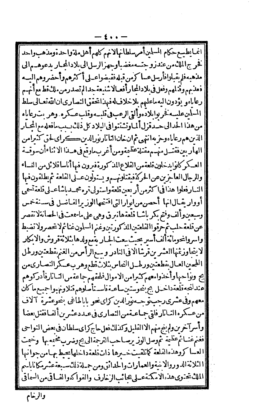 انما يُطِيع حكام الْمُسلمين أَمر سلطانها لانهم كلهم أهل مِلَّة وَاحِدَة وَمذهب وَاحِد فَخرج الْملك من عِنْد زَوجته مغضبا وجهز الرُّسُل الى بِلَاد المجار يَدعُوهُم الى مذْهبه فَلم يقبلُوا فَأرْسل عَسَاكِر من قبله فقبضوا على أَكْثَرهم وأحضروهم اليه فعذبهم وقتلهم وَفعل فى بِلَاد المجار أفعالا شنيعة جدا لم تصدر من ملك قطّ مَعَ أَنهم رعاياه ويؤدون اليه مَا عَلَيْهِم بِلَا خلاف لَهُ فَبِهَذَا تحقق النَّصَارَى ان الله تَعَالَى سلط الْمُسلمين عَلَيْهِ فخربوا بِلَاده وَألقى الرعب فى قلبه وقلب عسكره وهربت رعاياه من هَذَا الْحَد الى حد قزل ألما وتشتتوا فى الْبِلَاد كل ذَلِك بِسَبَب مَا فعله لَهُ مَعَ المجار الَّذين هم رعاياه وَحزبه انْتهى ثمَّ ان خَان التاتار نور الدّين كراى لحق كثيرا من الهاربين فَقتل مِنْهُم مقتلة عَظِيمَة وَمن أغرب مَا وَقع فى هَذَا الاثناء أَن سوقة الْعَسْكَر كَانُوا يدْخلُونَ قلعة من القلاع الْمَذْكُورَة فيرون فِيهَا أُنَاسًا قَلَائِل من النِّسَاء وللرجال العاجزين عَن الْحَرَكَة فيقتلونهم ويستولون على القلعة ثمَّ يطلقون فِيهَا النَّار فعلوا هَذَا فى اكثر من أَرْبَعِينَ قلعة وَاسْتولى قره مُحَمَّد باشا على قلعة تسمى أووار يُقَال انها أحصن من ايوارا الَّتِى افتتحها الْوَزير الْفَاضِل فى سنة خمس وَسبعين وَألف وَفتح بكر باشا قلعة هانبرق وهى على مَا سَمِعت فى الحصانة لَا تقصر عَن قلعة حلب ثمَّ حرقوا القلعتين المذكورتين وغنم الْمُسلمُونَ غَنَائِم لَا تحصر وَلَا تضبط واسروا نَحْو مائَة ألف أَسِير بِحَيْثُ بِيعَتْ الْجَارِيَة مَعَ وَلَدهَا بِثَلَاثَة قروش والابكار لَا يتَجَاوَز ثمنهَا الْعشْرين قرشا الا فى النَّادِر وَبيع الرَّأْس من الْغنم بقطعتين ورطل الطحين العال بقطعتين ورطل النّحاس بِثَلَاث قطع وهرب عَسْكَر النَّصَارَى من بج ونواحيها وَأخذُوا مَعَهم كثيرا من الاموال فلحقهم جمَاعَة من التاتار فأدركوهم عِنْد لنجة قلعة دَاخل بج بِنَحْوِ سِتِّينَ سَاعَة فاستأصلوهم قتلا ونهبوا جَمِيع مَا كَانَ مَعَهم وفى عشرى رَجَب توجه نور الدّين كراى نَحْو بَابا طاغى بِنَحْوِ عشرَة آلَاف من عسكره التاتار فلقى جمَاعَة من النَّصَارَى فى عدد عشْرين ألف فَقتل بعضلاا وَأسر آخَرين وَلم ينج مِنْهُم الا الْقَلِيل وَكَذَلِكَ فعل حَاج كراى سُلْطَان فى بعض النواحى فغنم غَنَائِم عَظِيمَة ثمَّ وصل الْوَزير صَاحب التَّرْجَمَة الى بج وَضرب مخيمه بهَا وخيمت العساكر وَهَذِه القلعة كَمَا تلقيت خَبَرهَا ذَات قلعة داخلها يُحِيط بهَا من جوانبها الثَّلَاثَة الدّور والابنية والعمارات والحدائق وَمن جملَة ذَلِك سَبْعَة عشر مَكَانا باسم الْملك تحتوى هَذِه الامكنة على عجائب الزخارف والفواكه والفساقى من السماقى