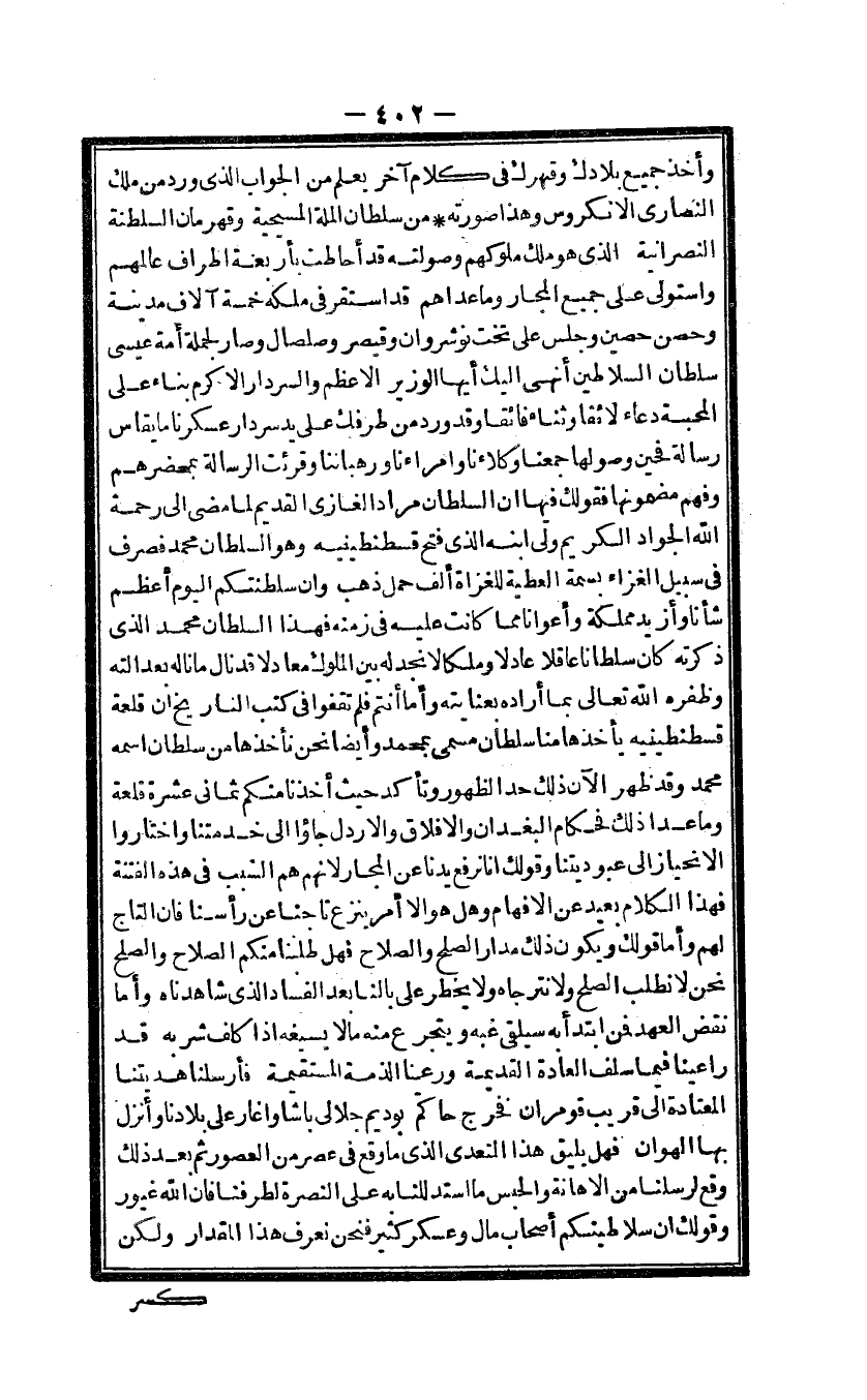 وَأخذ جَمِيع بلادك وفهرك فى كَلَام آخر يعلم من الْجَواب الذى ورد من ملك النَّصَارَى الانكروس وَهَذَا صورته من سُلْطَان الْملَّة المسيحية وقهرمان السلطنة النَّصْرَانِيَّة الذى هُوَ ملك مُلُوكهمْ وصولته قد أحاطت بأَرْبعَة اطراف عالمهم وَاسْتولى على جَمِيع المجار وَمَا عداهم قد اسْتَقر فى ملكه خَمْسَة آلَاف مَدِينَة وحصن حُصَيْن وَجلسَ على تخت نوشروان وَقَيْصَر وصلصال وَصَارَ لجملة أمة عِيسَى سُلْطَان السلاطين أنهى اليك أَيهَا الْوَزير الاعظم والسردار الاكرم بِنَاء على الْمحبَّة دُعَاء لائقا وثناء فائقا وَقد ورد من طرفك على يَد سردار عسكرنا مَا يُقَاس رِسَالَة فحين وصولها جَمعنَا وكلاءنا وامراءنا ورهباننا وقرئت الرسَالَة بمحضرهم وَفهم مضمونها فقولك فِيهَا ان السُّلْطَان مُرَاد الغازى الْقَدِيم لما مضى الى رَحْمَة الله الْجواد الْكَرِيم ولى ابْنه الذى فتح قسطنطينية وَهُوَ السُّلْطَان مُحَمَّد فصرف فى سَبِيل الغزاء بسمة الْعَطِيَّة للغزاة ألف حمل ذهب وان سلطنتكم الْيَوْم أعظم شَأْنًا وأزيد مملكة وأعوانا مِمَّا كَانَت عَلَيْهِ فى زَمَنه فَهَذَا السُّلْطَان مُحَمَّد الذى ذكرته كَانَ سُلْطَانا عَاقِلا عادلا وملكا لَا نجد لَهُ بَين الْمُلُوك معادلا قد نَالَ مَا ناله بعدالته وظفره الله تَعَالَى بِمَا أَرَادَهُ بعنايته وَأما أَنْتُم فَلم تقفوا فى كتب التَّارِيخ ان قلعة قسطنطينية يَأْخُذهَا منا سُلْطَان مُسَمّى بِمُحَمد وَأَيْضًا نَحن نأخذها من سُلْطَان اسْمه مُحَمَّد وَقد ظهر الان ذَلِك حد الظُّهُور وتأكذ حَيْثُ أَخذنَا مِنْكُم ثمانى عشرَة قلعة وَمَا عدا ذَلِك فحكام البغدان والافلاق والاردل جاؤا الى خدمتنا واختاروا الانحياز الى عبوديتنا وقولك انا نرفع يدنا عَن المجار لانهم هم السَّبَب فى هَذِه الْفِتْنَة فَهَذَا الْكَلَام بعيد عَن الافهام وَهل هُوَ الا أَمر ينْزع تاجنا عَن رَأْسنَا فان التَّاج لَهُم وَأما قَوْلك وَيكون ذَلِك مدَار الصُّلْح وَالصَّلَاح فَهَل طلبنا مِنْكُم الصّلاح وَالصُّلْح نَحن لَا نطلب الصُّلْح وَلَا نترجاه وَلَا يخْطر على بالنا بعد الْفساد الذى شَاهَدْنَاهُ وَأما نقض الْعَهْد فَمن ابْتَدَأَ بِهِ سيلقى غبه ويتجرع مِنْهُ مَالا يسيغه اذا كلف شربه قد راعينا فِيمَا سلف الْعَادة الْقَدِيمَة ورعينا الذِّمَّة المستقيمة فَأَرْسَلنَا هديتنا الْمُعْتَادَة الى قريب قومران فَخرج حَاكم بوديم جلالى باشا واغار على بِلَادنَا وَأنزل بهَا الهوان فَهَل يَلِيق هَذَا التعدى الذى مَا وَقع فى عصره من العصور ثمَّ بعد ذَلِك وَقع لرسلنا من الاهانة وَالْحَبْس مَا استدللنا بِهِ على النُّصْرَة لطرفنا فان الله غيور وَقَوله ان سلاطينكم أَصْحَاب مَال وعسكر كَثِيرَة فَنحْن نَعْرِف هَذَا الْمِقْدَار وَلَكِن
