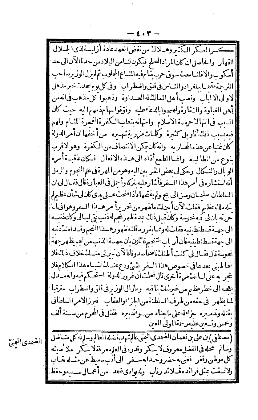 كسر الْعَسْكَر الْكثير وهلاك من نقض الْعَهْد عَادَة أزلية لذى الْجلَال القهار وَالْحَاصِل ان كَانَ المُرَاد الصُّلْح فَيكون لنا من الْبِلَاد من حدنا الْآن الى حد أسكوب والا فلنا مَعَك سوق حَرْب يُقَام فِيهَا الْمَتَاع المجلوب ثمَّ لم يزل الْوَزير صَاحب التَّرْجَمَة مُقيما ببلغراد وَالنَّاس فى قلق واضطراب وفى كل يَوْم يحدث خبر مذهل لاولى الالباب وَنصب أهل الممالك الْعَدَاوَة وذهبوا كل مَذْهَب فى انه من أهل الغباوة والشقاوة ولهجوا بِالدُّعَاءِ عَلَيْهِ وفوقوا سِهَام ذمهم اليه حَيْثُ كَانَ السَّبَب فى انتهاك حُرْمَة الاسلام وامتهانه بتغلب الْكَفَرَة الفجرة اللئام وَلَهُم فِئَة بِسَبَب ذَلِك أقاويل كَثِيرَة وَكلما مزرية شعيرَة من أخفها أَن أَمر الدولة كَانَ غَنِيا عَن هَذِه المحاربه وان كَانَ يُمكن الانتصاف من الْكَفَرَة وَهُوَ الاقرب بِنَوْع من المطالبه وانما الطمع أَدَّاهُ الى هَذِه الافعال فَكَانَ عَاقِبَة أمره الوبال والنكال وَحكى لى بعض المقربين اليه وَهُوَ من المهرة فى علم النُّجُوم والرمل أَنه استشاره فى أَمر هَذَا السّفر فَأَشَارَ عَلَيْهِ بِتَرْكِهِ وأجمل فى العبار قَالَ فَقَالَ لى ان السُّلْطَان سُلَيْمَان وصل الى بج وَلم يفتحها فاذا فتحت على يدى كَانَ لى شَأْن عَظِيم لم ينله ملك عَظِيم فَقلت الْآن أبين لَك مَا ظهر من تَحْرِير أَمر هَذَا السّفر وَهُوَ انى لما حررته بَان لى فِيهِ نحوسة وَكَانَ قبيل ذَلِك بِمدَّة ظهر نجم لَهُ ذَنْب بقى ليالى وَكَانَ ذَنبه الى جِهَة قسطنطينية فان أَرْبَاب التنجيم قَائِلُونَ بَان جِهَة الذَّنب من نجم يظْهر جِهَة نحوسة قَالَ فَقَالَ لى كنت أَظُنك ناصحا صَدُوقًا فَالْآن تبين لى مِنْك خلاف ذَلِك فَلَا تخاطبنى بعْدهَا فى خُصُوص هَذَا السّفر بشئ ودع عَنْك اشباه هَذَا الْكَلَام فَلَا تجريه على لسَانك مرّة أُخْرَى قَالَ فَعلمت ان غرور الدولة استحكم فِيهِ وانه مدل بعجبه الى خطر عَظِيم من غير شكّ يُنَافِيهِ وَمَا زَالَ الْوَزير فى قلق واضطرب مترقبا لما يظْهر فى حَقه من طرف السلطنة من الْجَزَاء وَالْعِقَاب فبرز الامر السلطانى بقتْله وتدميره جَزَاء لَهُ على مَا جناه من سوء تَدْبيره فَقتل فى الْمحرم من سنة ألف وَخمْس وَتِسْعين عَلَيْهِ رَحْمَة الْمولى الْمعِين