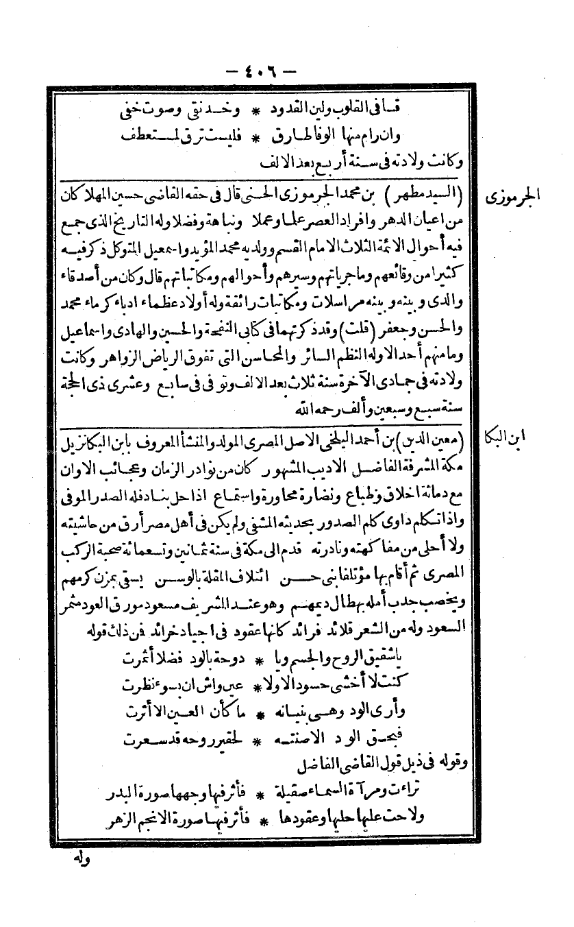 معِين الدّين بن أَحْمد البلخى الاصل المصرى المولد والمنشأ الْمَعْرُوف بِابْن البكا نزيل مَكَّة المشرفة الْفَاضِل الاديب الْمَشْهُور كَانَ من نَوَادِر الزَّمَان وعجائب الاوان مَعَ دمانة اخلاق وطباع ونضارة محاورة واستماع اذا حل بناد فَلهُ الصَّدْر الموفى واذا تكلم داوى كلم الصُّدُور بحَديثه المشفى وَلم يكن فى أهل مصر أرق من حَاشِيَته وَلَا أحلى من مفاكهته ونادرته قدم الى مَكَّة فى سنة ثَمَانِينَ وَتِسْعمِائَة صُحْبَة الركب المصرى ثمَّ أَقَامَ بهَا مؤتلفا بنى حسن ائتلاف المقلة بالوسن يسقى بمزن كرمهم ويخصب جَدب أمله بهطال ديمهم وَهُوَ عِنْد الشريف مَسْعُود مُورق الْعود مثمر السُّعُود وَله من الشّعْر قلائد فرائد كانها عُقُود فى اجياد خرائد فَمن ذَلِك قَوْله