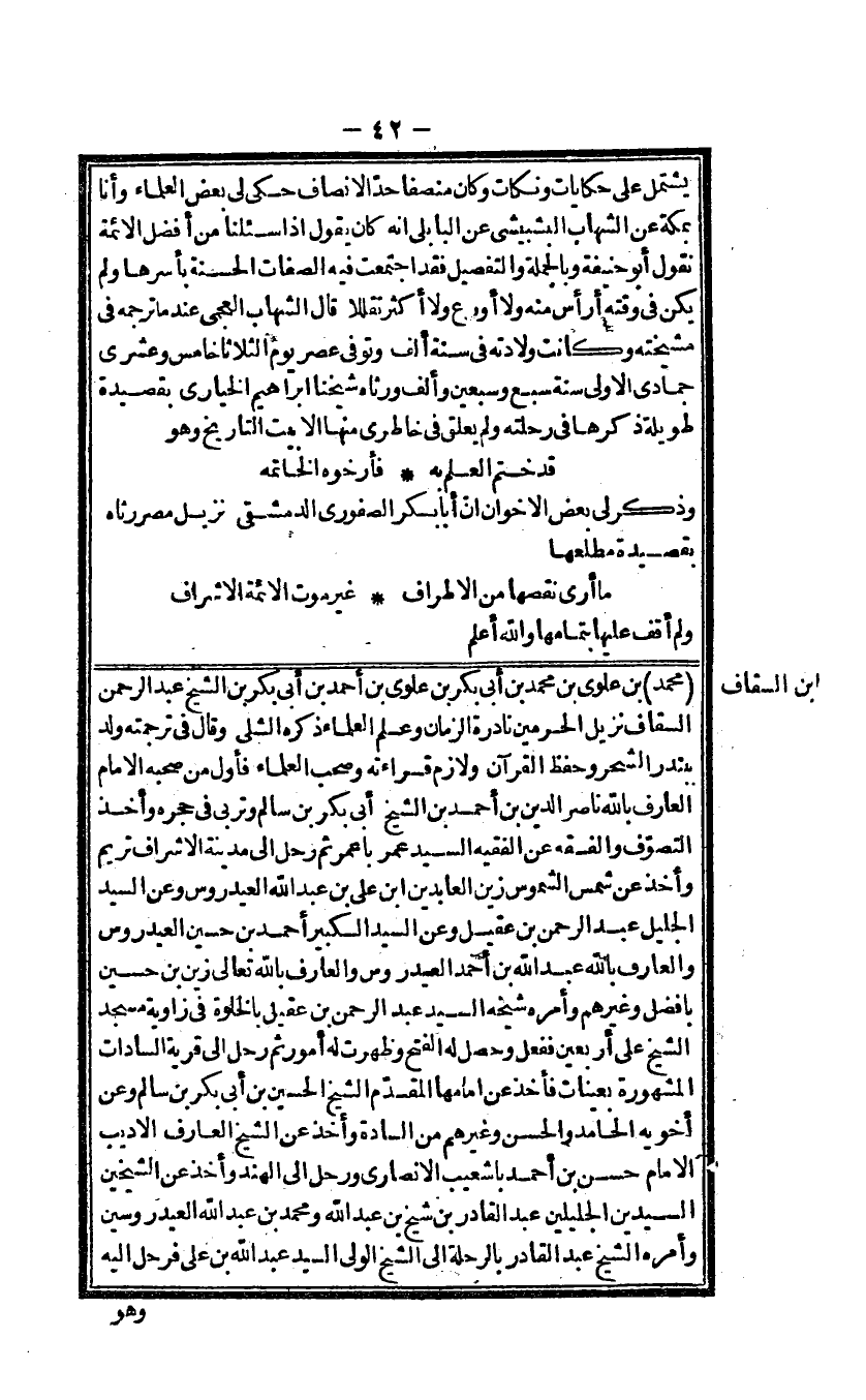 مُحَمَّد بن علوى بن مُحَمَّد بن أَبى بكر بن علوى بن أَحْمد بن أَبى بكر بن الشَّيْخ عبد الرَّحْمَن السقاف نزيل الْحَرَمَيْنِ نادرة الزَّمَان وَعلم الْعلمَاء ذكره الشلى وَقَالَ فى تَرْجَمته ولد ببندر الشحر وَحفظ الْقُرْآن ولازم قِرَاءَته وَصَحب الْعلمَاء فَأول من صَحبه الامام الْعَارِف بِاللَّه نَاصِر الدّين بن أَحْمد بن لاشيخ أَبى بكر بن سَالم وتربى فى حجره وَأخذ التصوف وَالْفِقْه عَن الْفَقِيه السَّيِّد عمر باعمر ثمَّ رَحل الى مَدِينَة الاشراف تريم وَأخذ عَن شمس الشموس زين العابدين ابْن على بن عبد الله العيدروس وَعَن السَّيِّد الْجَلِيل عبد الرَّحْمَن بن عقيل وَعَن السَّيِّد الْكَبِير أَحْمد بن حُسَيْن العيدروس والعارف بِاللَّه عبد الله بن أَحْمد الصيدروس والعارف بِاللَّه تَعَالَى زين بن حُسَيْن بَافضل وَغَيرهم ومأرمه شيخ السَّيِّد عبد الرَّحْمَن بن عقيل بالخلوة فى زَاوِيَة مَسْجِد الشَّيْخ على أَرْبَعِينَ فَفعل وَحصل لَهُ الْفَتْح وَظَهَرت لَهُ أُمُور ثمَّ رَحل الى قَرْيَة السادات الْمَشْهُورَة بعينات فَأخذ عَن امامها الْمُقدم الشَّيْخ الْحُسَيْن بن أَبى بكر بن سَالم وَعَن أَخَوَيْهِ الحامد وَالْحسن وَغَيرهم من السَّادة وَأخذ عَن الشَّيْخ الْعَارِف الاديب الامام حسن بن أَحْمد باشعيب الانصارى ورحل الى الْهِنْد وَأخذ عَن الشَّيْخَيْنِ السيدين الجليلين عبد الْقَادِر بن شيخ الله وَمُحَمّد بن عبد الله العيدروس وَأمره الشَّيْخ عبد الْقَادِر بالرحلة الى الشَّيْخ الولى السَّيِّد عبد الله بن على فَرَحل اليه