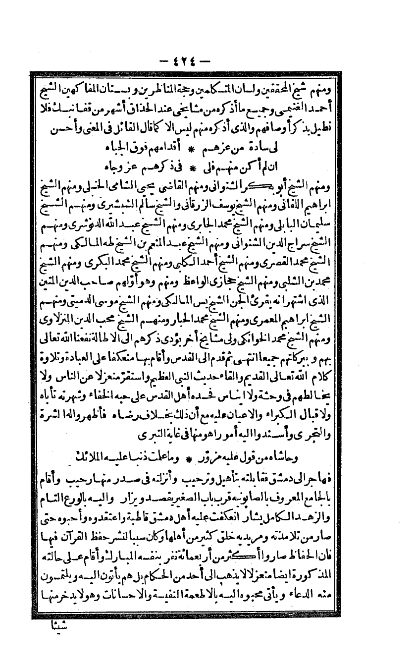 وَمِنْهُم شيخ الْمُحَقِّقين ولسان الْمُتَكَلِّمين وَحجَّة المناظرين وبستان المفاكهين الشَّيْخ أَحْمد الغنيمى وَجَمِيع مَا أذكرهُ من مشايخى عِنْد الحذاق أشهر من قفا نبك فَلَا نطيل بِذكر أوصافهم والذى أذكرهُ مِنْهُم لَيْسَ الا كَمَا قَالَ الْقَائِل فى الْمَعْنى وَأحسن