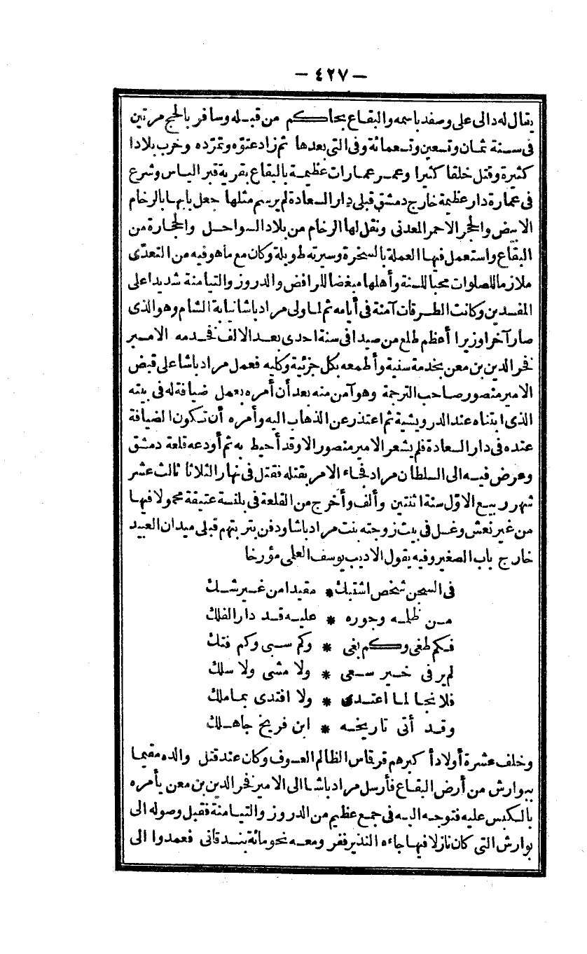 وَخلف عشرَة أَوْلَادًا أكبرهم قرقاس الظَّالِم العسوف وَكَانَ عِنْد قتل وَالِده مُقيما ببوارش من أَرض الْبِقَاع فَأرْسل مُرَاد باشا الى الامير فَخر الدّين بن معن يَأْمُرهُ بالكبس عَلَيْهِ فَتوجه اليه فى جمع عَظِيم من الدروز والتيامنة فَقبل وُصُوله الى بوارش الَّتِى كَانَ نازلا فِيهَا جَاءَهُ النذير ففر وَمَعَهُ نَحْو مائَة بندقانى فعمدوا الى