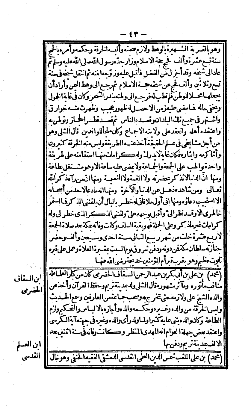 مُحَمَّد بن على بن أَبى بكر بن عبد الرَّحْمَن السقاف الحضرمى كَانَ من كبار الْعلمَاء لَهُ مَنَاقِب مأثوره ومآثر مشهوره قَالَ الشلى ولد بِمَدِينَة تريم وَحفظ الْقُرْآن وَأخذ عَن وَالِده الشَّيْخ على ولازمه حَتَّى تخرج بِهِ وَصَحب جمَاعَة من العارفين وَسمع الحَدِيث وَلبس الْخِرْقَة من وَالِده وَغَيره وَحكمه وَالِده وَأَجَازَهُ بالالباس والتحكيم وَلزِمَ الطَّاعَة وَكَانَ وَالِده يثنى عَلَيْهِ كثيرا وَلما ولد رأى وَالِده وَغَيره فى جَبهته آيَة الكرسى واعتقد بعض جهلة الْعَوام انه المهدى المنتظر وَكَانَت وَفَاته فى سنة اثْنَتَيْنِ بعد الالف بِمَدِينَة تريم وَدفن لَهَا