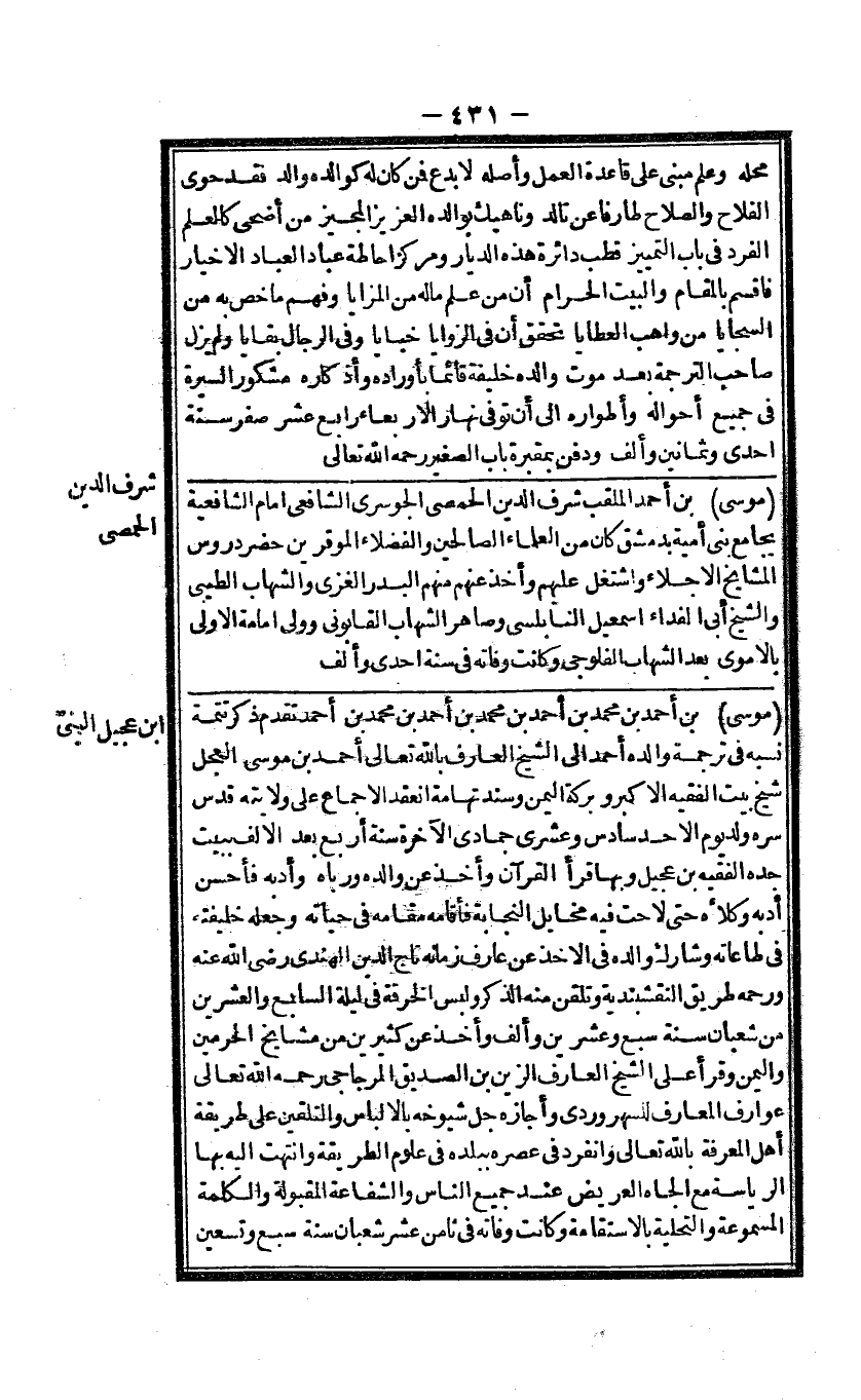 مُوسَى بن أَحْمد بن مُحَمَّد بن أَحْمد بن مُحَمَّد بن أَحْمد بن مُحَمَّد بن أَحْمد تقدم ذكر تَتِمَّة نسبه فى تَرْجَمَة وَالِده أَحْمد الى الشَّيْخ الْعَارِف بِاللَّه تَعَالَى أَحْمد بن مُوسَى الْعجل شيخ بَيت الْفَقِيه الاكبر وبركة الْيمن وَسَنَد تهَامَة انْعَقَد الاجماع على ولَايَته قدس سره ولد يَوْم الاحد سادس وعشرى جُمَادَى الْآخِرَة سنة أَربع بعد الالف بِبَيْت جده الْفَقِيه بن عجيل وَبهَا قَرَأَ الْقُرْآن وَأخذ عَن وَالِده ورباه وأدبه فَأحْسن أدبه وكلأه حَتَّى لاحت فِيهِ مخايل النجابة فأقامه مقَامه فى حَيَاته وَجعله خَلِيفَته فى طاعاته وشارك وَالِده فى الاخذ عَن عَارِف زَمَانه تَاج الدّين الهندى رضى الله عَنهُ ورحمه طَرِيق النقشبندية وتلقن مِنْهُ الذّكر وَلبس الْخِرْقَة فى لَيْلَة السَّابِع وَالْعِشْرين من شعْبَان سنة سبع وَعشْرين وَألف وَأخذ عَن كثيرين من مَشَايِخ الْحَرَمَيْنِ واليمن وَقَرَأَ على الشَّيْخ الْعَارِف الزين بن الصّديق المرجاجى رَحمَه الله تَعَالَى عوارف المعارف للسهروردى وَأَجَازَهُ جلّ شُيُوخه بالالباس والتلقين على طَريقَة أهل الْمعرفَة بِاللَّه تَعَالَى وَانْفَرَدَ فى عصره بِبَلَدِهِ فى عُلُوم الطَّرِيقَة وانتهت اليه بهَا الرياسة مَعَ الجاه العريض عِنْد جَمِيع النَّاس والشفاعة المقبولة والكلمة المسموعة والتحلية بالاستقامة وَكَانَت وَفَاته فى ثامن عشر شعْبَان سنة سبع وَتِسْعين
