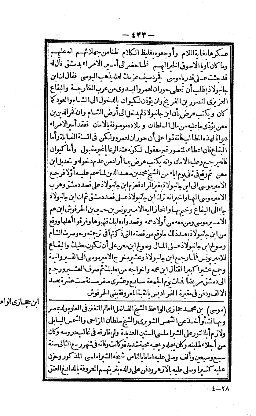 عسكرها بغاية الملام وأوجعوه بغليظ الْكَلَام ظنا من جهلائهم انه عَلَيْهِم وَمَا كَانَ نَاوِيا الا سوق الْخَيْر اليهم فَلَمَّا حضر الى أَمِير الامراء بِدِمَشْق قَالَ لَهُ قد جِئْت على قدر يَا مُوسَى فَجرد سيف عزمك لَعَلَّه يذهب البوسى فَقَالَ ان ابْن جانبولاذ يطْلب أَن تُعْطى حوران لعمر والبدوى من عرب المفارجة وَالْبِقَاع العزيزى لمنصور بن الفريخ وان يُؤذن لكيوان بِالدُّخُولِ الى الشَّام وَالْعود كَمَا كَانَ وَيكْتب عرض بِأَن ابْن جانبولاذ لم يدْخل الى أَرض الشَّام وان فَخر الدّين بن معن يُؤدى مَا عَلَيْهِ من مَال السُّلْطَان وبلاده مَوْصُوفَة بالامان فعقد أَمِير الامراء ديوانا لهَذِهِ المطالب فاتفقوا على أَن حواران لعَمْرو وَلَكِن فى السّنة الْقَابِلَة وَأما الْبِقَاع فان اعطاءه لمنصور غير مَعْقُول لكَونه عِنْد الرعايا غير مَقْبُول وَأما كيوان فانه يرجع وَعَلِيهِ الامان وانه يكْتب عرض بِمَا أَرَادَ من عدم دُخُوله وبتعديل ابْن معن ثمَّ وَقع فى ثانى يَوْم اباء من الشَّيْخ مُحَمَّد بن سعد الدّين لما صمم عَلَيْهِ أَولا فَرجع الامير مُوسَى الى ابْن جانبولاذ بِغَيْر المُرَاد فعزم ابْن جانبولاذ على قصد دمشق وهرب الامير مُوسَى اليها وَاخْبَرْ انه ترك ابْن جانبولاذ على قصد دمشق ثمَّ ان ابْن جانبولاذ جَاءَ الى الْبِقَاع وخيم بهَا وانحاز اليه الامير يُونُس بن حُسَيْن بن الحرفوش ابْن عَم الامير مُوسَى وَمن مَعَه من أَوْلَاد عَمه وقصدوا بعلبك فنهبوها وَفرقُوا أَهلهَا وَوَقع من ابْن جانبولاذ بعد ذَلِك مَا وَقع من قصَّته الَّتِى ذكرتها فى تَرْجَمته وحوصرت الشَّام وصولح ابْن جانبولاذ على المَال وصولح ابْن معن على أَن تكون بعلبك وَالْبِقَاع للامير يُونُس فَلَمَّا رَجَعَ ابْن جانبولاذ وعشيره خرج الامير مُوسَى الى القيروانية وَجمع عشيرا كَبِيرا لقِتَال ابْن عَمه واخراجه من بعلبك ثمَّ صرف العشير وَرجع الى دمشق مَرِيضا فَمَاتَ يَوْم الْجُمُعَة سَابِع وعشرى صفر سنة سِتّ عشرَة بعد الالف وَدفن فى مَقْبرَة الفراديس بالقبة الْمَعْرُوفَة ببنى الحرفوش