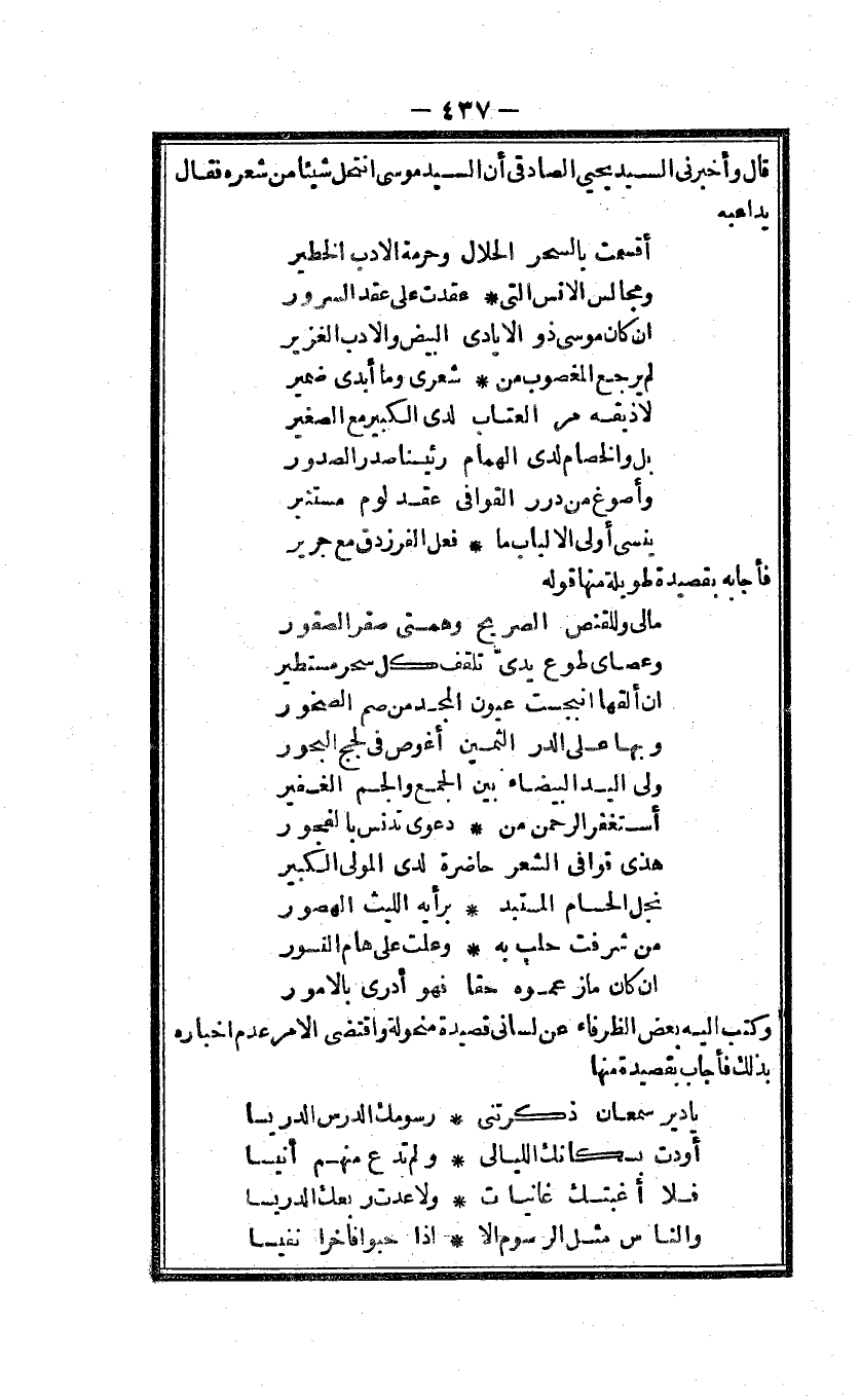 قَالَ وأخبرنى السَّيِّد يحيى الصادقى أَن السَّيِّد مُوسَى انتحل شَيْئا من شعره فَقَالَ يداعبه