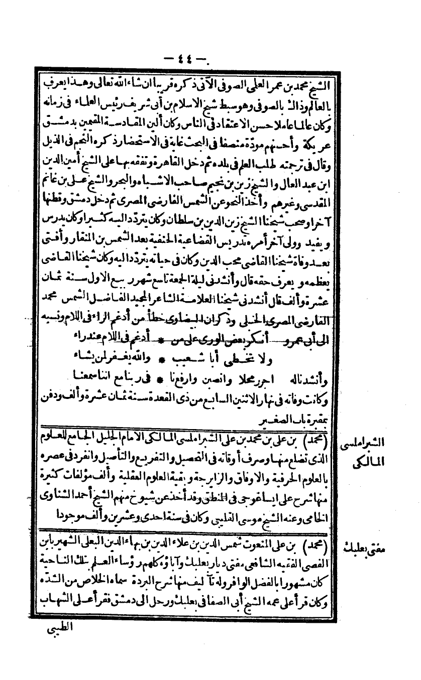 مُحَمَّد بن على بن مُحَمَّد بن على الشبراملسى المالكى الامام الْجَلِيل الْجَامِع للعلوم الذى تضلع مِنْهَا وَصرف أوقاته فى التَّحْصِيل والتفريع والتأصيل وَانْفَرَدَ فى عصره بالعلوم الحرفية والاوفاق والزايرجة وَبَقِيَّة الْعُلُوم الْعَقْلِيَّة وَألف مؤلفات كَثِيرَة مِنْهَا شرح على ايساغوجى فى الْمنطق وَقد أَخذ عَن شُيُوخ مِنْهُم الشَّيْخ أَحْمد الشناوى الخامى وَعنهُ الشَّيْخ مسوى القليبى وَكَانَ فى سنة احدى وَعشْرين وَألف مَوْجُودا