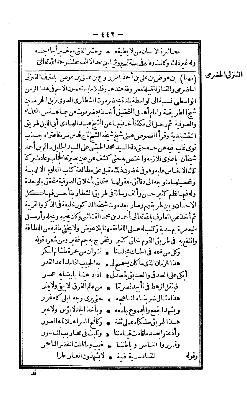 مهنا بن عوض بن على بن أَحْمد بامزروع بن على بن عوض بامترف القنزلى الحضرمى والقنازلة قَبيلَة مَعْرُوفَة عِنْدهم وقليلا مَا يستعملون الِاسْم فى هَذَا الزَّمن الواسطى نِسْبَة الى الْوَاسِطَة بَلْدَة بحضرموت الشطارى الصوفى نزيل الْحَرَمَيْنِ شيخ الطَّرِيقَة وامام أهل التَّحْقِيق أَخذ بحضرموت عَن جمَاعَة من الْعلمَاء والصوفية ثمَّ رَحل الى مَكَّة فَأخذ بهَا عَن الشَّيْخ عبد الهادى أَبى اللَّيْل طَرِيق النقشبندية وَقَرَأَ الفصوص على شيخ شَيْخه الشَّيْخ تَاج قدس سره فاعتراه جذب قوى غَابَ فِيهِ عَن حسه حَتَّى دله السَّيِّد مُحَمَّد الحبشى على السَّيِّد الْجَلِيل سَالم بن أَحْمد شَيْخَانِ باعلوى فلازمه واختص بِهِ حَتَّى كشف عَن عين بصيرته الْحجاب وعادت بركَة تِلْكَ الانفاس عَلَيْهِ وَهُوَ فى غُضُون ذَلِك مقبل على مطالعة كتب الْعُلُوم الالهية وتحصيلها مُتَوَجّه الى دقائق معقولها متخلق بأخلاق الصُّوفِيَّة مُتَحَقق بالوحدة وَله فِيهَا نظم كثير حسن وَألف رِسَالَة فى طَرِيق الشطارية أحسن فِيهَا كل الاحسان وَبَين طريقهم وَصَارَ بعد موت شَيْخه الْمَذْكُور خَليفَة فى الذّكر والتربية ثمَّ أَخذ عَن الْعَارِف بِاللَّه تَعَالَى أَحْمد بن مُحَمَّد القشاشى وَكَانَ يُحِبهُ ويجله وَأرْسل اليه مرّة بهدية وَكتب لَهُ على اللفافة مهنا بِلَا عوض وَلَا يخفى مَا فِيهِ من اللطافة وانتفع بِهِ فى طَرِيق الْقَوْم خلق كثير وَتخرج بِهِ جم غفير وَمن شعره قَوْله