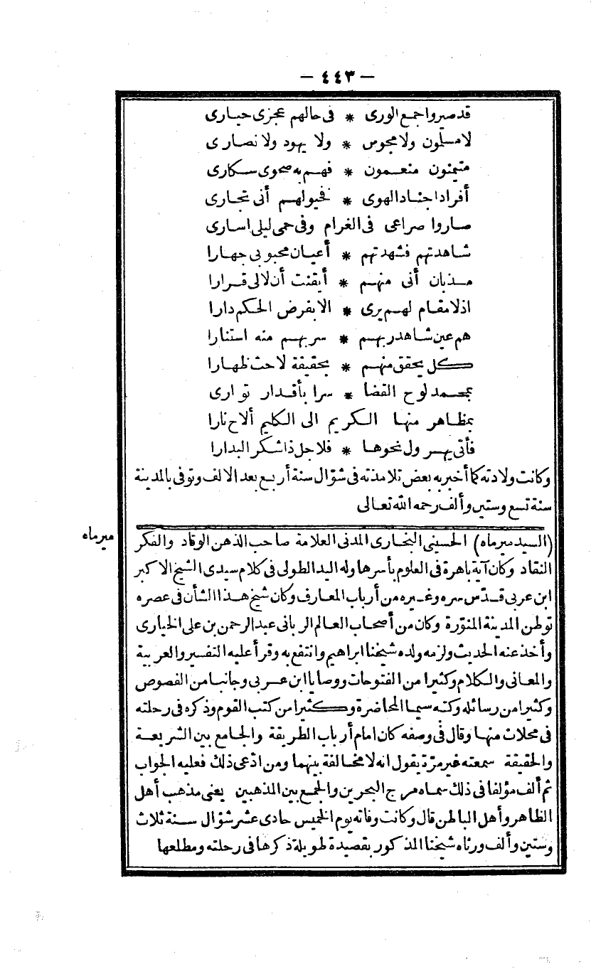 السَّيِّد ميرماه الحسينى البخارى المدنى الْعَلامَة صَاحب الذِّهْن الْوَقَّاد والفكر النقاد وَكَانَ آيَة باهرة فى الْعُلُوم بأسرها وَله الْيَد الطُّولى فى كَلَام سيدى الشَّيْخ الاكبر ابْن عربى قدس سره وَغَيره من أَرْبَاب المعارف وَكَانَ شيخ هَذَا الشَّأْن فى عصره توطن الْمَدِينَة المنورة وَكَانَ من أَصْحَاب الْعَالم الربانى عبد الرَّحْمَن بن على الخيارى وَأخذ عَنهُ الحَدِيث وَلَزِمَه وَلَده شَيخنَا ابراهيم وانتفع بِهِ وَقَرَأَ عَلَيْهِ التَّفْسِير والعربية والمعانى وَالْكَلَام وَكَثِيرًا من الفتوحات ووصايا ابْن عربى وجانبا من الفصوص وَكَثِيرًا من رسائله وَكتبه سِيمَا المحاضرة وَكَثِيرًا من كتب الْقَوْم وَذكره فى رحلته فى محلات مِنْهَا وَقَالَ فى وَصفه كَانَ امام أَرْبَاب الطَّرِيقَة وَالْجَامِع بَين الشَّرِيعَة والحقيقة سمعته غير مرّة يَقُول انه لَا مُخَالفَة بَينهمَا وَمن ادّعى ذَلِك فَعَلَيهِ الْجَواب ثمَّ ألف مؤلفا فى ذَلِك سَمَّاهُ مرج الْبَحْرين وَالْجمع بَين المذهبين يعْنى مَذْهَب أهل الظَّاهِر وَأهل الْبَاطِن قَالَ وَكَانَت وَفَاته يَوْم الْخَمِيس حادى عشر شَوَّال سنة ثَلَاث وَسِتِّينَ وَألف ورثاه شَيخنَا الْمَذْكُور بقصيدة طَوِيلَة ذكرهَا فى رحلته ومطلعها