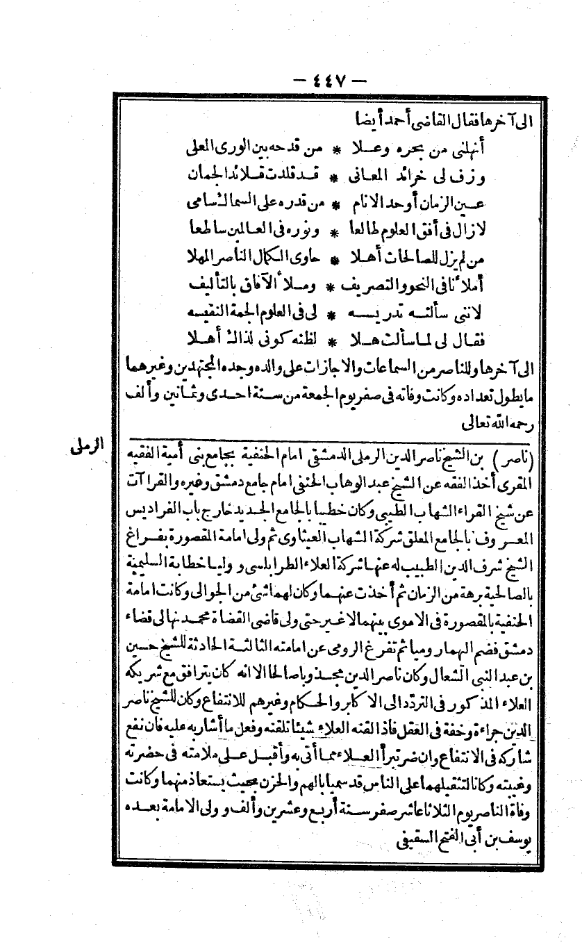نَاصِر بن الشَّيْخ نَاصِر الدّين الرملى الدمشقى امام الْحَنَفِيَّة بِجَامِع بنى أُميَّة الْفَقِيه المقرى اخذ الْفِقْه عَن الشَّيْخ عبد الْوَهَّاب الحنفى امام جَامع دمشق وَغَيره والقراآت عَن شيخ الْقُرَّاء الشهَاب الطيبى وَكَانَ خَطِيبًا بالجامع الْجَدِيد خَارج بَاب الفراديس الْمَعْرُوف بالجامع الْمُعَلق شركَة الشهَاب العيثاوى ثمَّ ولى امامة الْمَقْصُورَة بفراغ الشَّيْخ شرف الدّين الطَّبِيب لَهُ عَنْهَا شركَة الْعَلَاء الطرابلسى وليا خطابة السليمية بالصالحية بُرْهَة من الزَّمَان ثمَّ أخذت عَنْهُمَا وَكَانَ لَهما شئ من الجوالى وَكَانَت امامة الْحَنَفِيَّة بالمقصورة فى الاموى بَينهمَا لَا غير حَتَّى ولى قاضى الْقُضَاة مُحَمَّد نهالى قَضَاء دمشق فضم اليهما روميا ثمَّ تفرغ الرومى عَن امامته الثَّالِثَة الْحَادِثَة للشَّيْخ حُسَيْن بن عبد النبى الشعال وَكَانَ نَاصِر الدّين مجذوبا صَالحا الا انه كَانَ يترافق مَعَ شَرِيكه الْعَلَاء الْمَذْكُور فى التَّرَدُّد الى الاكابر والحكام وَغَيرهم للِانْتِفَاع وَكَانَ للشَّيْخ نَاصِر الدّين جَرَاءَة وخفة فى الْعقل فاذا لقنه الْعَلَاء شَيْئا تلقنه وَفعل مَا أَشَارَ بِهِ عَلَيْهِ فان نفع شَاركهُ فى الِانْتِفَاع وان ضرّ تَبرأ الْعَلَاء مِمَّا أَتَى بِهِ وَأَقْبل على ملامته فى حَضرته وغيبته وَكَانَا لتثقيلهما على النَّاس قد سميا بالهم والحزن بِحَيْثُ يستعاذ مِنْهُمَا وَكَانَت وَفَاة النَّاصِر يَوْم الثلاثا عَاشر صفر سنة أَربع وَعشْرين وَألف وَولى الامامة بعده يُوسُف بن أَبى الْفَتْح السقيفى