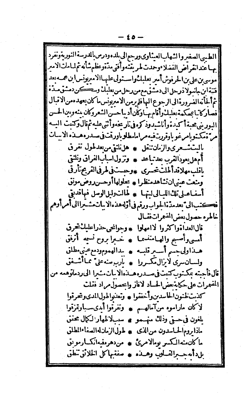 الطيبى الصَّغِير والشهاب العيثاوى وَرجع الى بَلَده ودرس بِالْمَدْرَسَةِ النورية وَتفرد بهَا عِنْد انْقِرَاض الْفُضَلَاء وحمدت طَرِيقَته وَأفْتى مُدَّة وَعظم شَأْنه ثمَّ لما ماست الامير مُوسَى بن على بن الحرفوش أَمِير بعلبك وَاسْتولى عَلَيْهَا الامير يُونُس ابْن عَمه بعد فتْنَة ابْن جانبولاذ رَحل الى دمشق مَعَ من رَحل من بعلبك وَسكن دمشق مُدَّة ثمَّ ألجأته الضَّرُورَة الى الرُّجُوع اليها فَلم ير من الامير يُونُس مَا كَانَ يعهده من الاقبال فَصَارَ كَاتبا محكمَة بعلبك وَأقَام بهَا وَكَانَ أديبا حسن الشّعْر وَكَانَ بَينه وَبَين الْحسن البورينى محبَّة أكيدة وَأَنا شيد وَذكره فى تَارِيخه وَأثْنى عَلَيْهِ ثمَّ قَالَ وكتبت اليه مرّة مَكْتُوبًا مرغوبا وقررت فِيهِ مراما مَطْلُوبا ورقت فى صَدره هَذِه الابيات