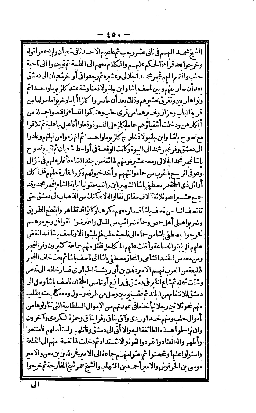 الشَّيْخ مُحَمَّد اليهم فى ثانى عشر رَجَب ثمَّ عَاد يَوْم الاحد ثانى شعْبَان وَلم يسمعوا قَوْله وَخَرجُوا بعد قِرَاءَة الحكم عَلَيْهِم وَالْكَلَام مَعَهم الى الطّيبَة ثمَّ توجهوا الى نَاحيَة حلب وانضم اليهم غجر مُحَمَّد الجلالى وعشيره ثمَّ رجعُوا فى أَوَاخِر شعْبَان الى دمشق بعد أَن صَار بَينهم وَبَين ناصف باشا وَابْن جانبولاذ مناوشة عِنْد كلز يَوْمًا وَاحِدًا ثمَّ ولوا هاربين وتفرق عشيرهم وَذَلِكَ بعد أَن حاصروا كلزا أَيَّامًا وخربوا مَا حولهَا من قَرْيَة الْبَاب وعزاز وَغَيرهمَا من قرى حلب وهتكوا النِّسَاء وافتضوا جملَة أبكارهن وَدخلت أشقياؤهم حَماما بكلز على النسْوَة وفعلوا أفاعيل جَاهِلِيَّة ثمَّ تلاقوا مَعَ نصوح باشا وَابْن جانبولاذ خَارج كلز يَوْمًا وَاحِدًا ثمَّ انْهَزمُوا من ليلتهم وعادوا الى دمشق وفر غجر مُحَمَّد الى البيوة وَكَانَت الْوَقْعَة فى أواسط شعْبَان ثمَّ تتبع نصوح باشا غجر مُحَمَّد الجلالى وَمَعَهُ عشيره وَمِنْهُم طَائِفَة من جند الشَّام فَأَغَارَ عَلَيْهِم فى شَوَّال وَهُوَ فى الرّبيع بِالْقربِ من حماه وانتهبهم وَأخذ خيولهم وَكرر الْغَارة عَلَيْهِم فَلَمَّا كَانَ أَوَائِل ذى الْحجَّة مر مصطفى باشا الشهير بِابْن راضيه مُتَوَلِّيًا نِيَابَة الشَّام بغجر مُحَمَّد وَقد جمع عشيرا نَحْو ثَلَاثَة آلَاف مقَاتل فَقَالُوا لَهُ لَا نمكنك من الذّهاب الى دمشق حَتَّى تنتصف لنا من ناصف باشا فَسَار مَعَهم مكْرها وَكَانُوا قد تظاهروا ابقطع الطَّرِيق وضربوا على أهل حمص وحماه ضَرَائِب من المَال واعترضوا القوافل وجرموهم فَخَرجُوا بمصطفى باشا من حماه الى نَاحيَة حلب فَلم يثبتوا لَهُ سَاعَة وأفلت عَلَيْهِم المكاحل فَقتل مِنْهُم جمَاعَة كَثِيرُونَ وفر الغجر وَمن مَعَه من الْجند الشامى وانحاز مصطفى باشا الى ناصف باشا ثمَّ بعث خَلفه الى تدمر وشتت شَمله ثمَّ شاع الْخَبَر فى دمشق فى رَابِع أَو خَامِس الْحجَّة ان ناصف باشا وصل الى دمشق للانتقام من الْجند ثمَّ عقب يَوْمَيْنِ وصل من طرفه رَسُول وَمَعَهُ كتاب مِنْهُ يطْلب مِنْهُم نَحْو ثَلَاثِينَ رجلا ليَأْخُذ مَا فى عهدتهم من الاموال السُّلْطَانِيَّة الَّتِى تناولوها من أَمْوَال حلب وَمِنْهُم خدا وردى وآق يناق وقرايناق وَحَمْزَة الكردى وَآخَرُونَ وان لم يسلمُوا هَذِه الطَّائِفَة اليه والا أَتَى الى دمشق وَقَاتلهمْ واستأصلهم فامتنعوا وأظهروا لَهُ العناد والتمرد وَالْقُوَّة والاشتداد ثمَّ دخلت طَائِفَة مِنْهُم الى القلعة واستولوا عَلَيْهَا وتحصنوا ثمَّ بعثوا مِنْهُم جمَاعَة الى الامير فَخر الدّين بن معن والامير مُوسَى بن الحرفوش والامير أَحْمد بن الشهَاب وَالشَّيْخ عمر شيخ المفارجة ثمَّ خَرجُوا