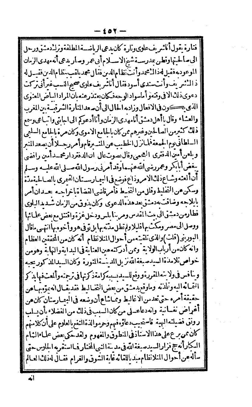 فَتَارَة يَقُول أَنا شرِيف علوى وَتارَة كَانَ يدعى الرياضة الْمُطلقَة وَترك دمشق ورحل الى صالحيتها وقطن بمدرسة شيخ الاسلام أَبى عمر وَصَارَ يدعى أَنه مهدى الزَّمَان الْمَوْعُود بِهِ فَقيل لَهُ ذَاك مُحَمَّد وَأَنت نظام الدّين فَقَالَ مُحَمَّد يلقب بنظام الدّين فَقيل لَهُ ذَاك شرِيف وَأَنت سندى أسود فَقَالَ أَنا شرِيف علوى صَحِيح النّسَب غير أَنى تركت دَعْوَى ذَلِك الا فى وقته وَأما سَواد الْوَجْه فَكَانَ يعْتَذر عَنهُ بَان المُرَاد الْبيَاض المعنوى الذى يكون فى الافعال وَزَاد بِهِ الْحَال الى أَن صعد المنارة الشرقية بَين الْمغرب وَالْعشَاء وَقَالَ يَا أهل دمشق أَنا مهدى الزَّمَان وَأَنا أدعوكم الى اجابتى واتباعى وَسمع ذَلِك كثير من الصَّالِحين وَغَيرهم مِمَّن كَانَ بالجامع الاموى وَكَانَ مرّة بالجامع السليمى السلطانى يَوْم الْجُمُعَة فَلَمَّا نزل الْخَطِيب عَن الْمِنْبَر قَامَ وَأمر رجلا أَن يصعد الْمِنْبَر ويلعن أَمِين الدفترى العجمى وَقَالَ بِصَوْت عَال ان الدفتر دَار مُحَمَّد أَمِين رافضى يبغض أَبَا بكر وَعمر رضى الله عَنْهُمَا وَقد أمرنى رَسُول الله