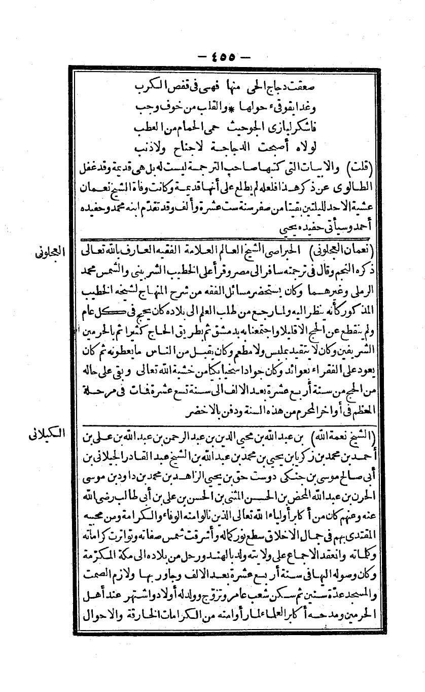 نعْمَان العجلونى الحبراصى الشَّيْخ الْعَالم الْعَلامَة الْفَقِيه الْعَارِف بِاللَّه تَعَالَى ذكره النَّجْم وَقَالَ فى تَرْجَمته سَافر الى مصر وَقَرَأَ على الْخَطِيب الشربينى وَالشَّمْس مُحَمَّد الرملى وَغَيرهمَا وَكَانَ يستحضر مسَائِل الْفِقْه من شرح الْمِنْهَاج لشيخه الْخَطِيب الْمَذْكُور كَأَنَّهُ ينظر اليه وَلما رَجَعَ من طلب الْعلم الى بِلَاده كَانَ يحجّ فى كل عَام وَلم يَنْقَطِع عَن الْحَج الا قَلِيلا واجتمعنا بِهِ بِدِمَشْق ثمَّ بطرِيق الْحَاج كثيرا ثمَّ بالحرمين الشريفين وَكَانَ لَا يتَقَيَّد بملبس وَلَا مطعم وَكَانَ يقبل من النَّاس مَا يعطونه ثمَّ كَانَ يعود على الْفُقَرَاء بعوائد وَكَانَ جوادا سخيا بكيا من خشيَة الله تَعَالَى وبقى على حَاله من الْحَج من سنة أَربع عشرَة بعد الالف سنة تسع عشرَة فَمَاتَ فى مرحلة الْمُعظم فى أَوَاخِر الْمحرم من هَذِه السّنة وَدفن بالاخضر