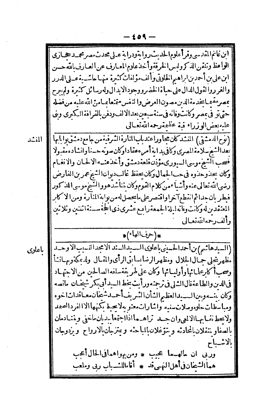 السَّيِّد هَاشم بن أَحْمد الحسينى باعلوى السَّيِّد السَّنَد الامجد النسيب الاوحد مظهر تجلى جمال الْجلَال ومظهر الرِّضَا بسابق الرأى والمقال ولد بِمَكَّة وَبهَا نَشأ وَصَحب أكَابِر عُلَمَاء وأولياء وَكَانَ على طَريقَة سلفه الصَّالِحين من الإجتهاد فى الدّين وَالطَّاعَة قَالَ الشلى فى تَرْجَمته وَرَأَيْت بِخَط السَّيِّد أَبى بكر شَيْخَانِ مَا نَصه وَكَانَ بَينه وَبَين السَّيِّد الْعَظِيم الشَّأْن الشريف أَحْمد شَيْخَانِ معاقدات اخوه ومباسطات حلوه وصلات سنيه واشارات معنويه لَا يُحِيط بكهنها الا الْفَرد الصَّمد وَلَا يحط نقابها الا لمعى وان جد تراهما اذا اجْتمعَا يبديان مَا خفى ويتنادمان بالصفا وينتقلان بالمحادثه ويتوغلان بالمباحثه ويمتزجان بالارواح ويزدوجان بالاشباح