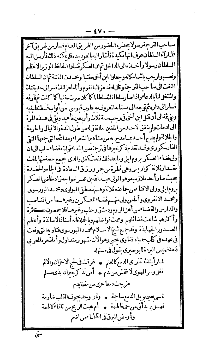 صَاحب التَّرْجَمَة رَسُولا يحذرهُ الْحُضُور من الطَّرِيق الْعَام فَسَار من طَرِيق آخر فَلَمَّا رَآهُ السُّلْطَان عرف انها مكيدة فَأَشَارَ اليه بِالْعودِ بِيَدِهِ فَلم يُمكنهُ ذَلِك فَأرْسل اليه السُّلْطَان رَسُولا وَأَخذه الى الدَّاخِل ثمَّ ان الْعَسْكَر قتلوا الْحَافِظ الْوَزير الاعظم ونصبوا رَجَب باشا مَكَانَهُ وَجعلُوا ابْن أخى مفتيا وخمدت الْفِتْنَة ثمَّ ان السُّلْطَان الْتفت الى صَاحب التَّرْجَمَة وَقَالَ لَهُ قد عزلك الْقَوْم وَأَنا مَا عزلتك فسر الى حديقتك واشتغل لنا بِالدُّعَاءِ واذا صَار سلطانك سُلْطَانا كَمَا كَانَ صرت مفتيا كَمَا كنت ثمَّ فَارقه فَسَار الى دَاره ثمَّ توجه الى بستانه الْمَعْرُوف بِهِ بطوب قبوسى من أَبْوَاب قسطنطينية وبقى ثمَّة الى أَن قتل ابْن أخى فى رَجَب سنة ثَلَاث وَأَرْبَعين فأعيد وبقى فى هَذِه الْمرة الى ان مَاتَ وَلم يتَّفق لَاحَدَّ من الْمُفْتِينَ مَا اتّفق لَهُ من طول الْمدَّة والاقبال وَالْحُرْمَة وَالْجَلالَة وَلم يمدح أحد بِمَا مدح بِهِ من مشاهير الشُّعَرَاء ومدائحه الَّتِى جمعهَا التقى الفارسكورى وَقد تقدم ذكر خَبَرهَا فى تَرْجَمَة من ابْتِدَاء تَوليته قَضَاء حلب الى ان ولى قَضَاء الْعَسْكَر بروم ايلى وَمَا بعد ذَلِك فقد تكفل والدى بِجمع حِصَّة مِنْهَا بلغت مِقْدَار ثَلَاثَة كراريس وهى قَطْرَة من بَحر ورزق السَّعَادَة فى الجاه والحفدة بِحَيْثُ صَار أحد ملازميه وَهُوَ الْمولى عبد الله بن عمر خواجه زَاده قاضى الْعَسْكَر بروم ايلى وَولى الافتاء من جماعته ثَلَاثَة وهم مصطفى البولوى وَمُحَمّد البورسوى وَمُحَمّد الانقروى وَأما من ولى مِنْهُم قَضَاء العسكرين وَغَيرهمَا من المناصب والمدارس وَالْقَضَاء من أهل الرّوم ودمشق وحلب وَغَيرهَا فَلَا يُحصونَ كَثْرَة وَأَكْثَرهم شاعت فضائلهم وعمت فواضلهم وَبِالْجُمْلَةِ فانه أستاذ الاساتذة وَأعظم الصُّدُور الجهابذة وَقد جمع شيخ الاسلام مُحَمَّد البورسوى فَتَاوِيهِ الَّتِى وَقعت فى عَهده فى كتاب سَمَّاهُ فَتَاوَى يحيى وَهُوَ الْآن مَشْهُور متداول وَأما شعره العربى فَمِنْهُ تخميس الْبردَة للبوصيرى يَقُول فى مستهله